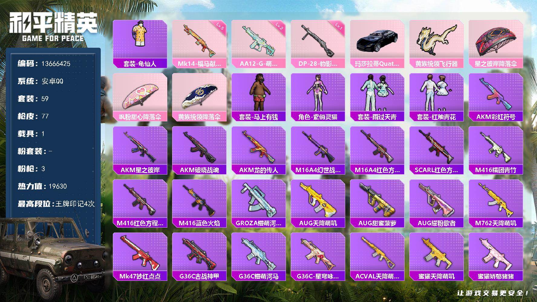 59套装/枪械3/装备63/载具1/战备65/王牌印记4/热力值19630/五