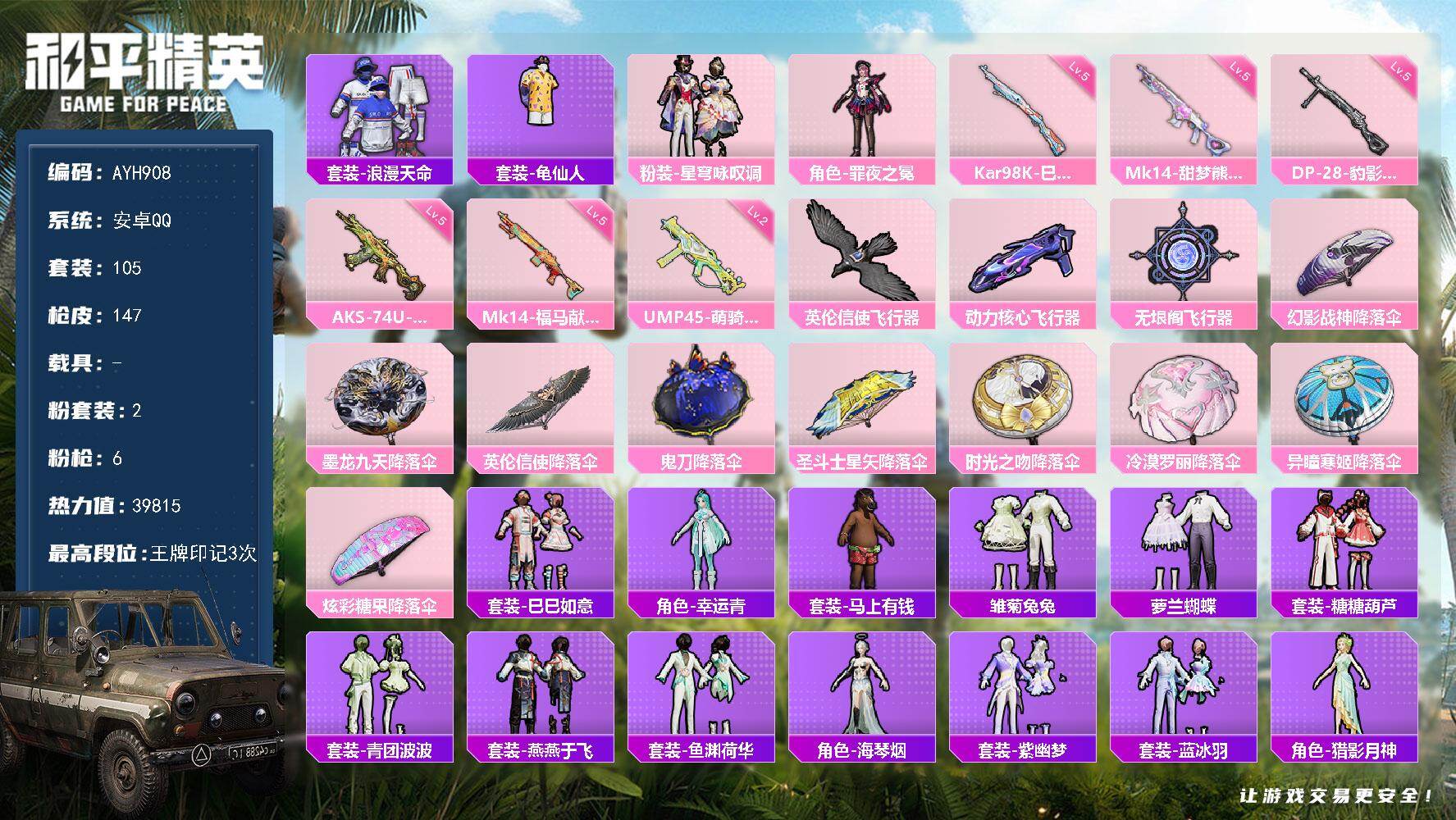 安卓 手Q-2粉装-6特效枪-0载具-3粉色飞行器-39815热力值-3王牌印