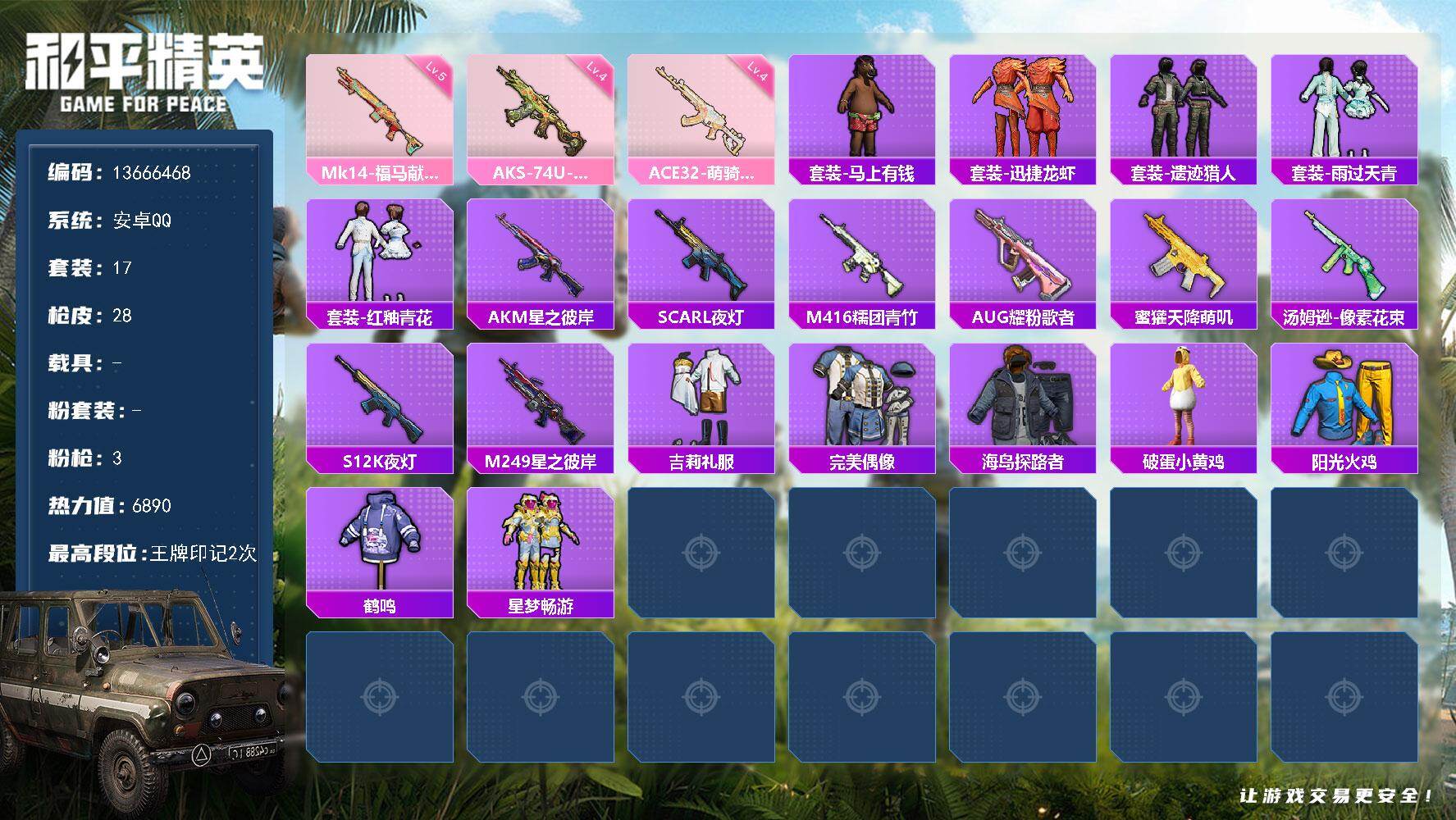 粉枪3/套装17/枪皮28/热力值6890/历史最高段位:王牌印记2次/Lv: