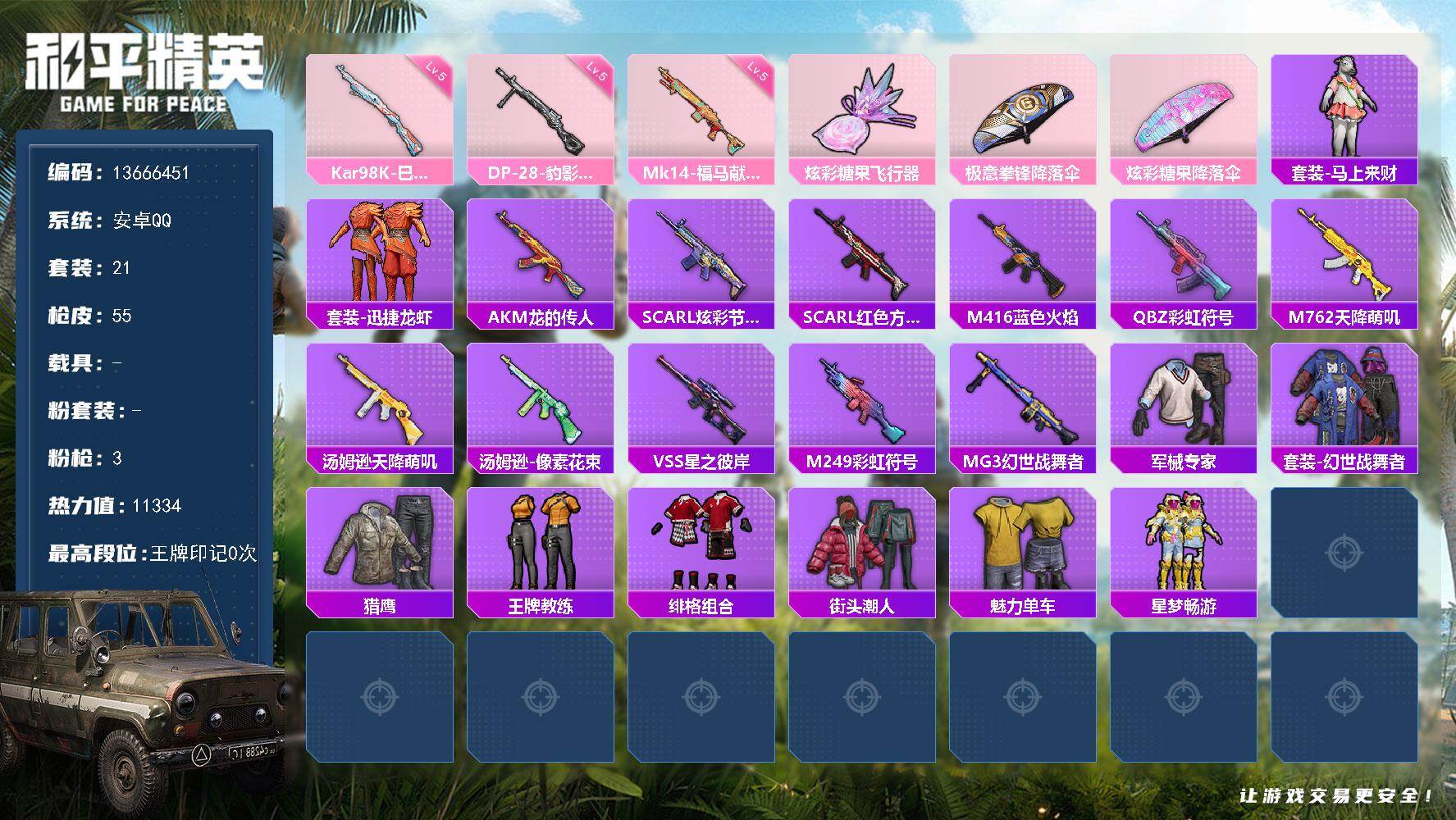 安卓 手Q-0粉装-2特效枪-0载具-0粉色飞行器-8289热力值-1王牌印记