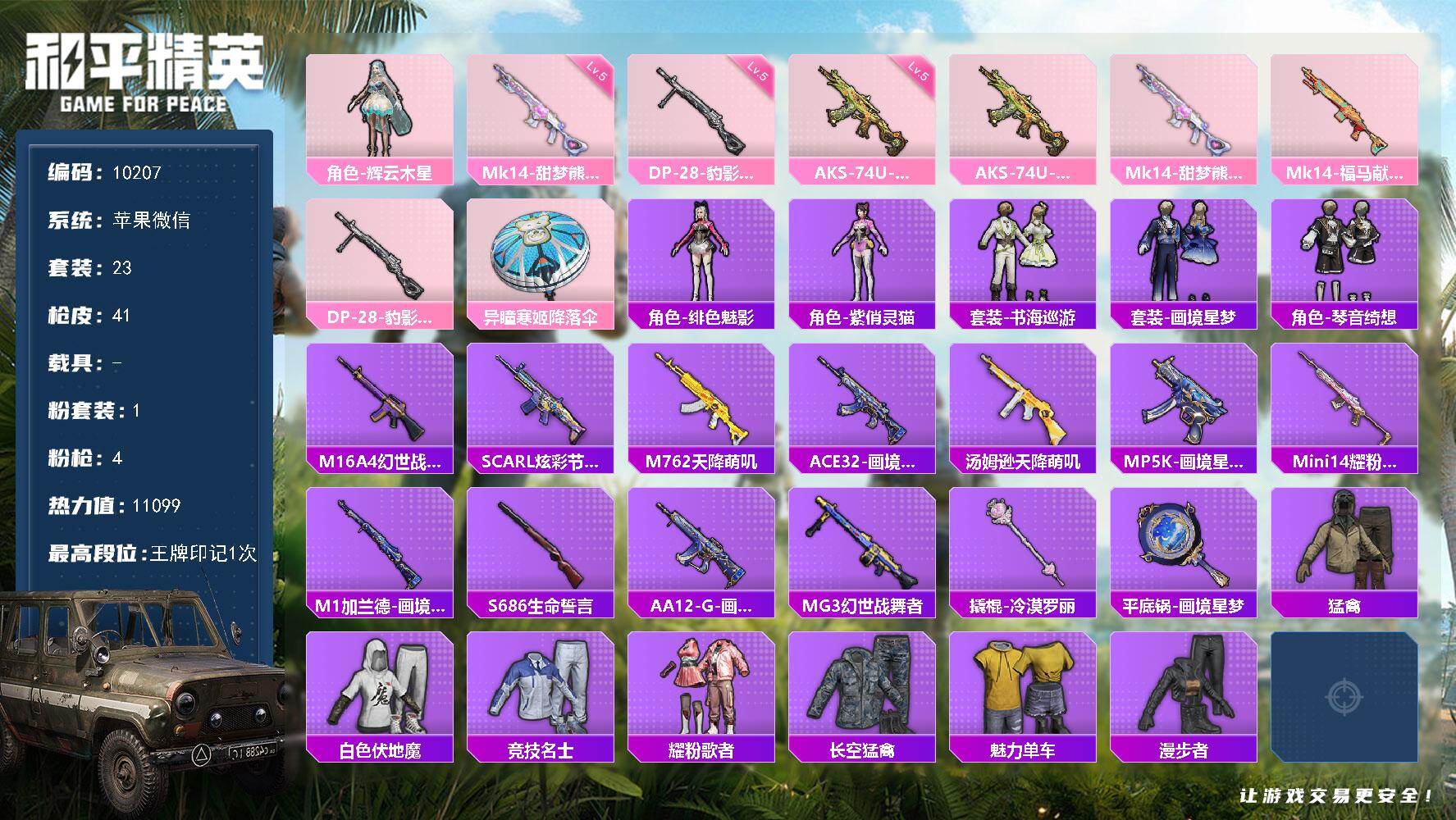 苹果 微信-1粉装-4特效枪-0载具-0粉色飞行器-11099热力值-1王牌印