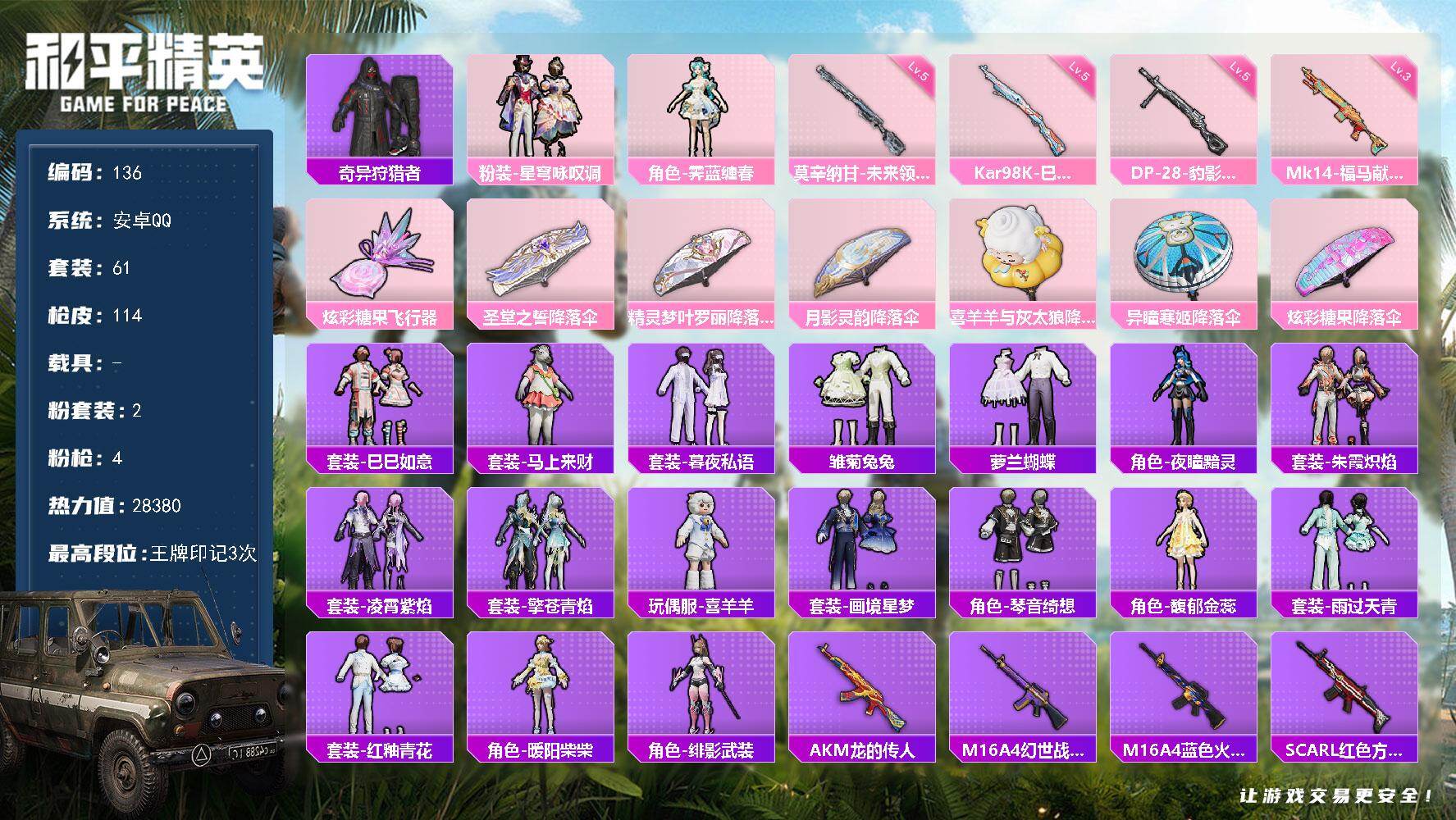 安卓 手Q-1粉装-7特效枪-0载具-1粉色飞行器-46107热力值-12王牌