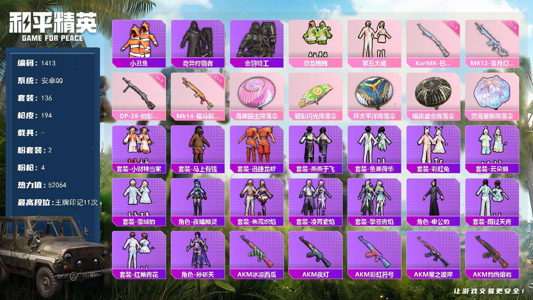 安卓手Q-7王牌印记-1粉装-8特效枪-38271热力值-111套装-147枪皮