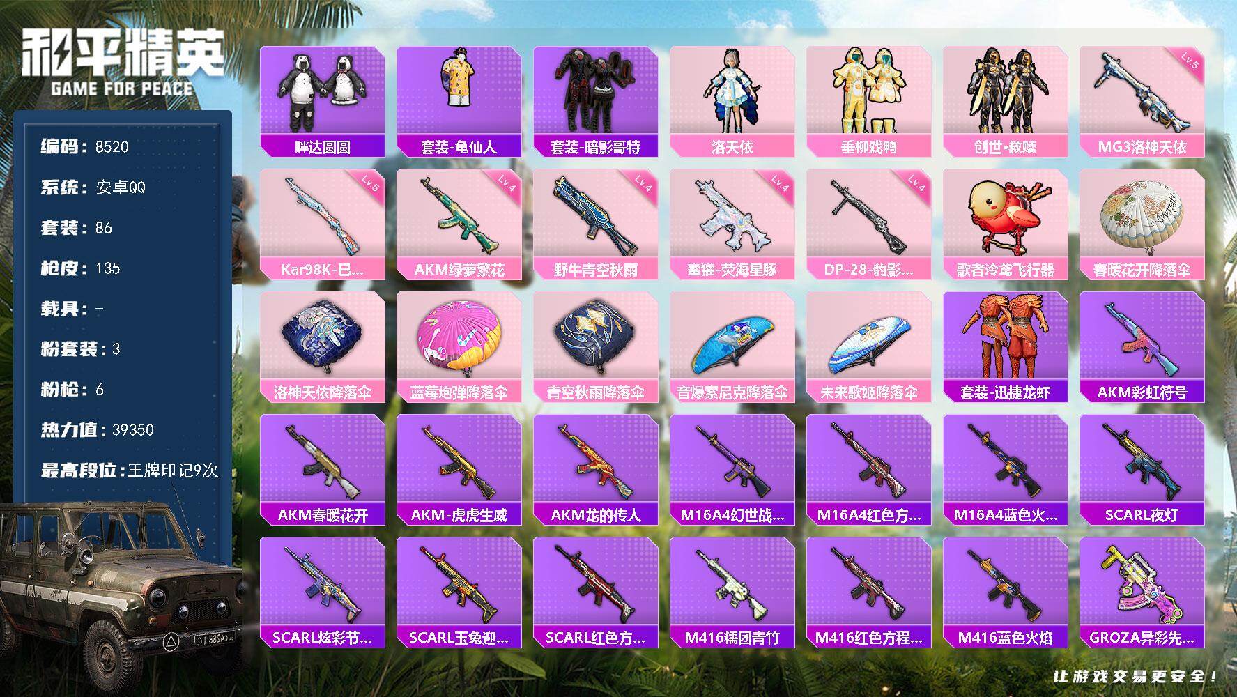 【8520】3粉装-6特效枪-0载具-1粉色飞行器-39350热力值-9王牌印
