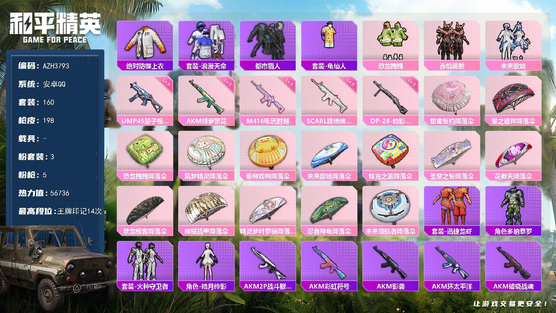 洛天依等3套粉装,5级akm,5级scar,5级m416,5级98k,7级DP28,12个印记