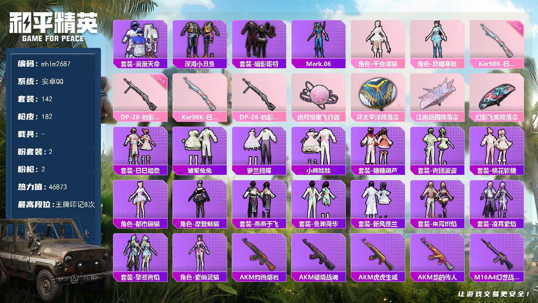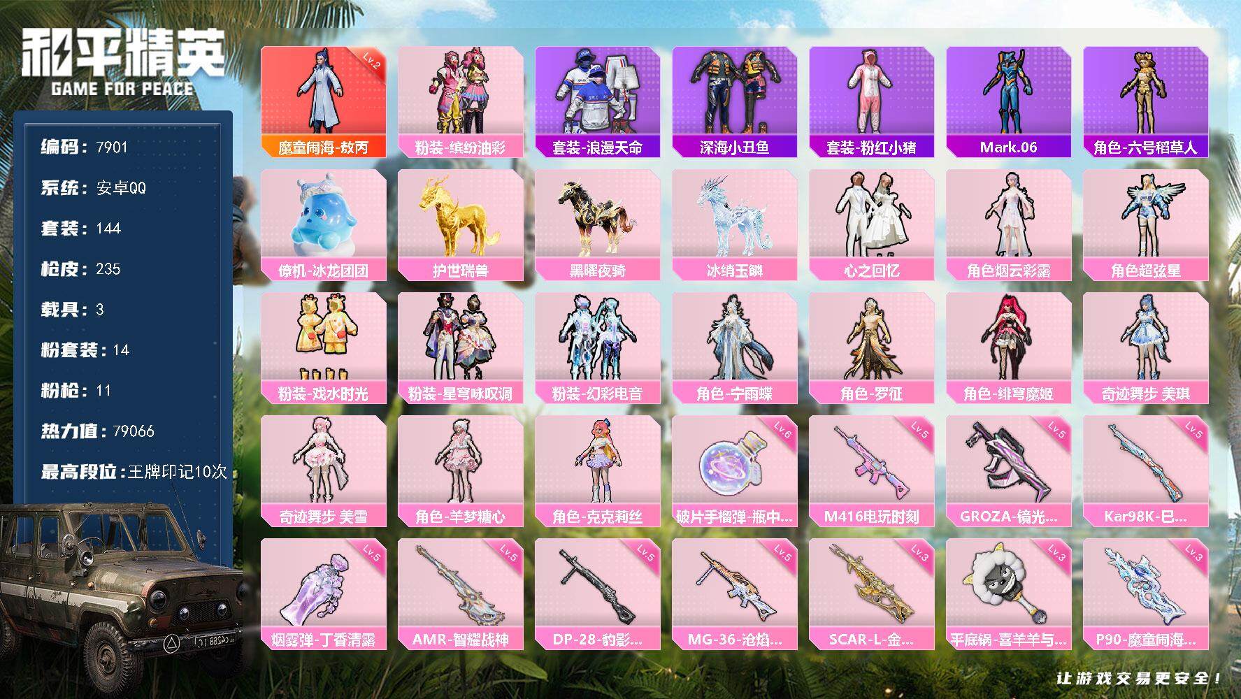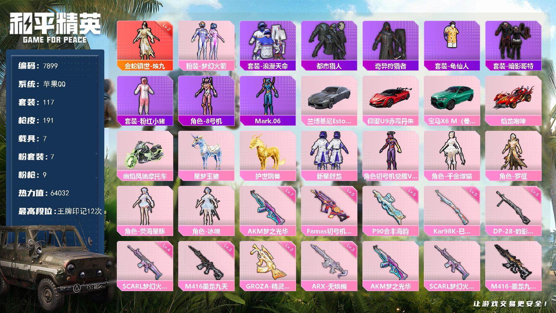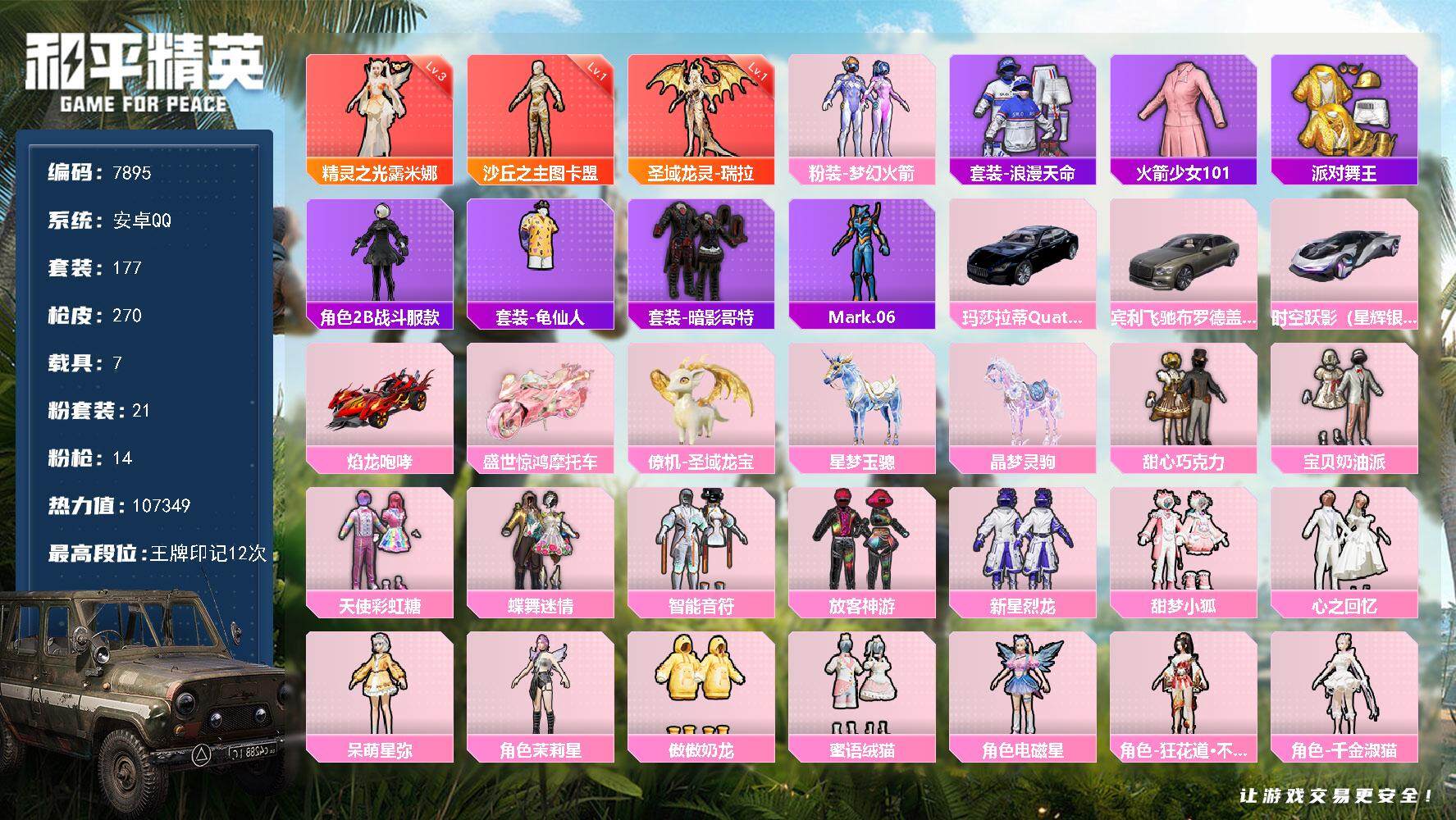 安卓QQ-无二次包人脸-9王牌印记-9粉装-5红装-20特效枪-8载具-110644热力值-战备72
