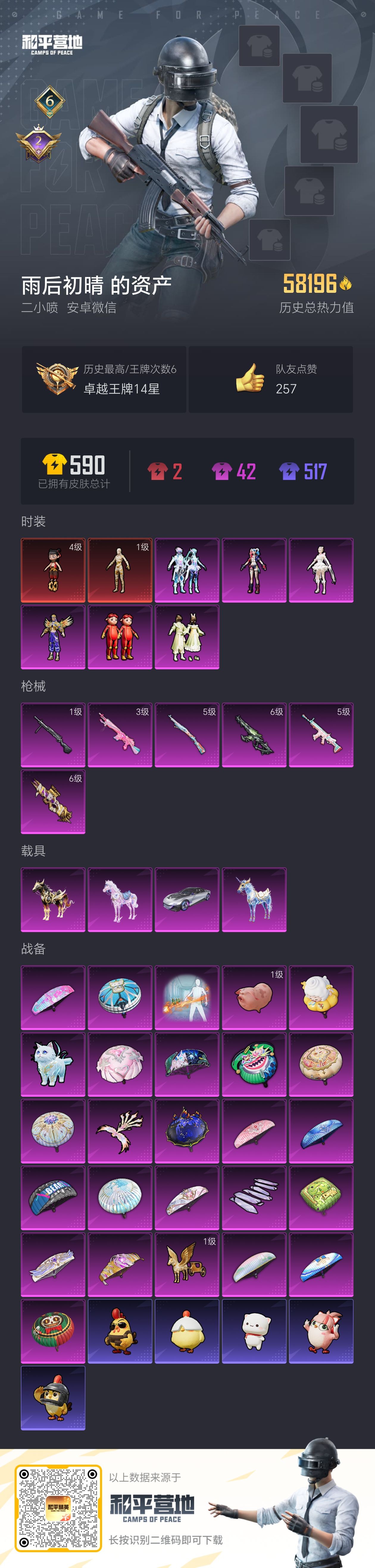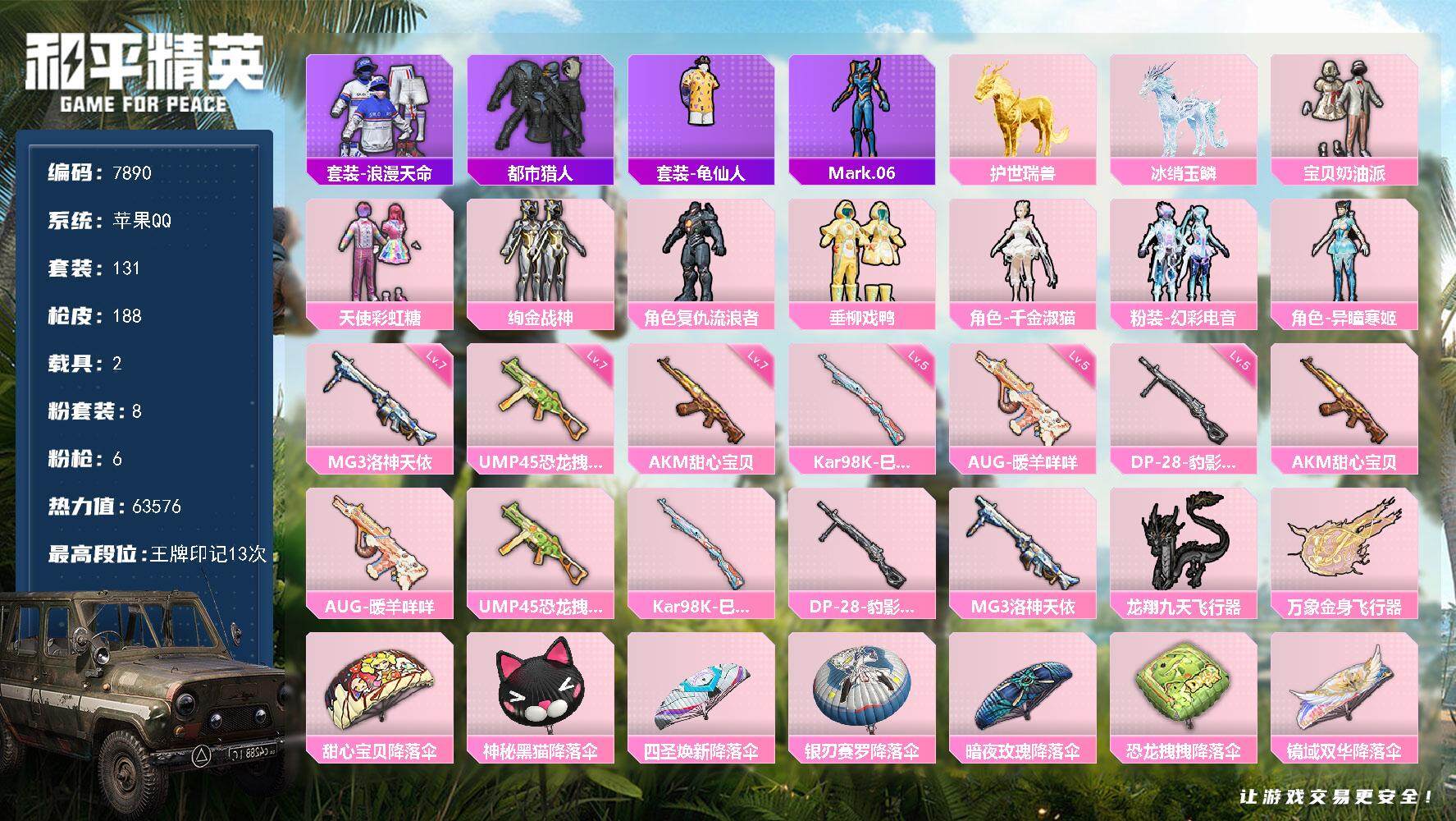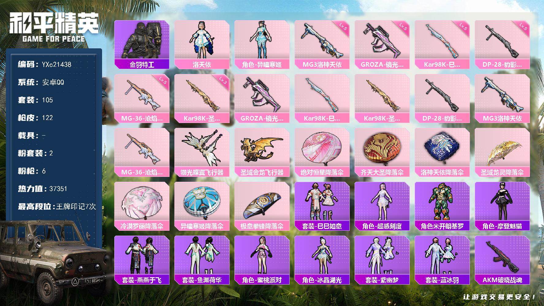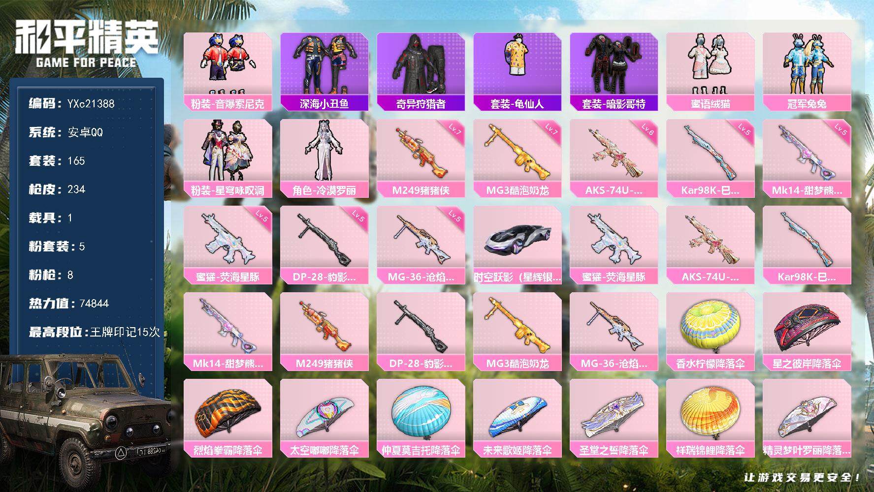安卓QQ-无二次包人脸-9王牌印记-9粉装-5红装-20特效枪-8载具-110644热力值-战备72