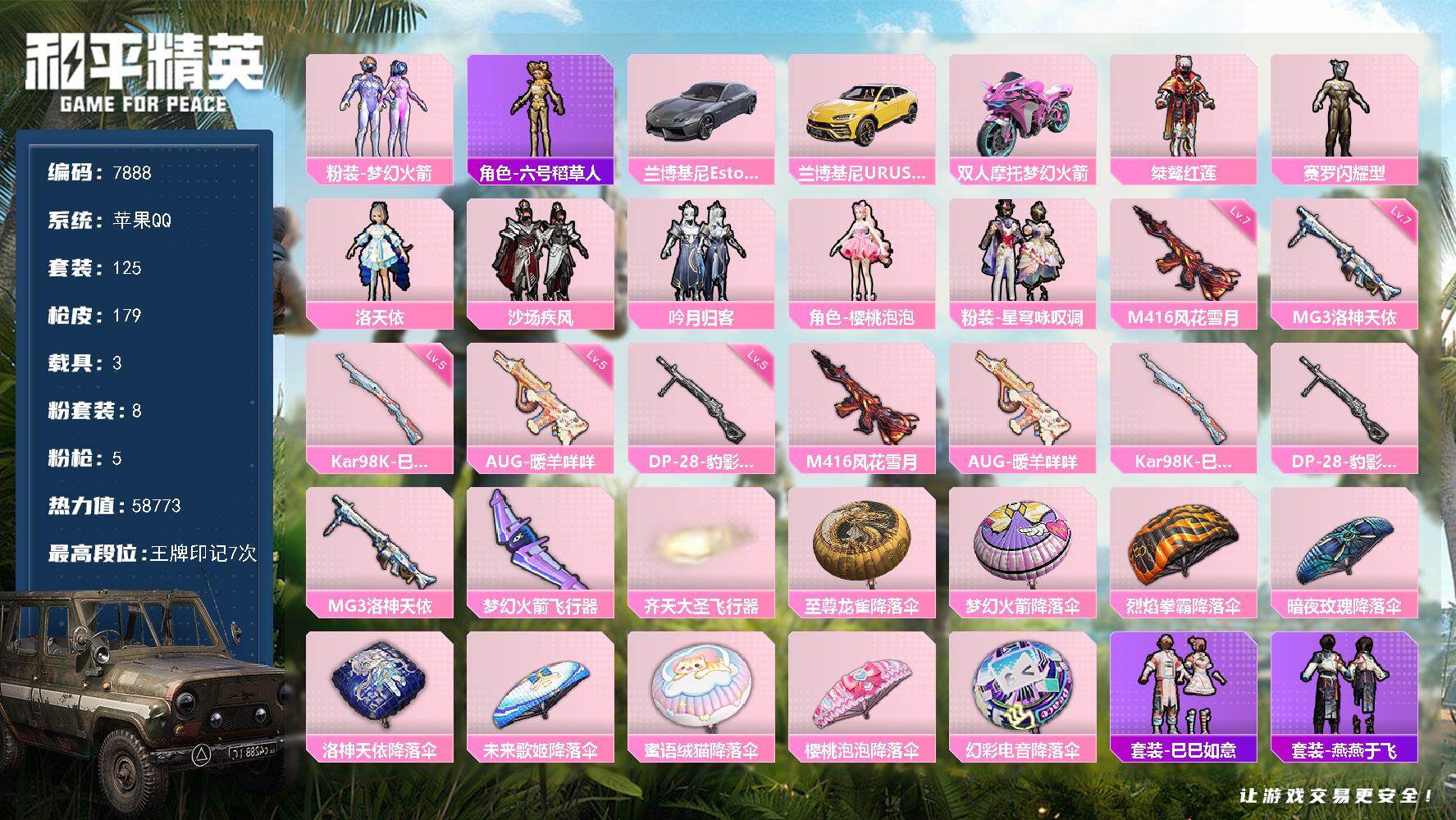 hs51208 苹果手Q-9王牌印记-1红装-5粉装-7特效枪-1载具-69341热力值-141套装