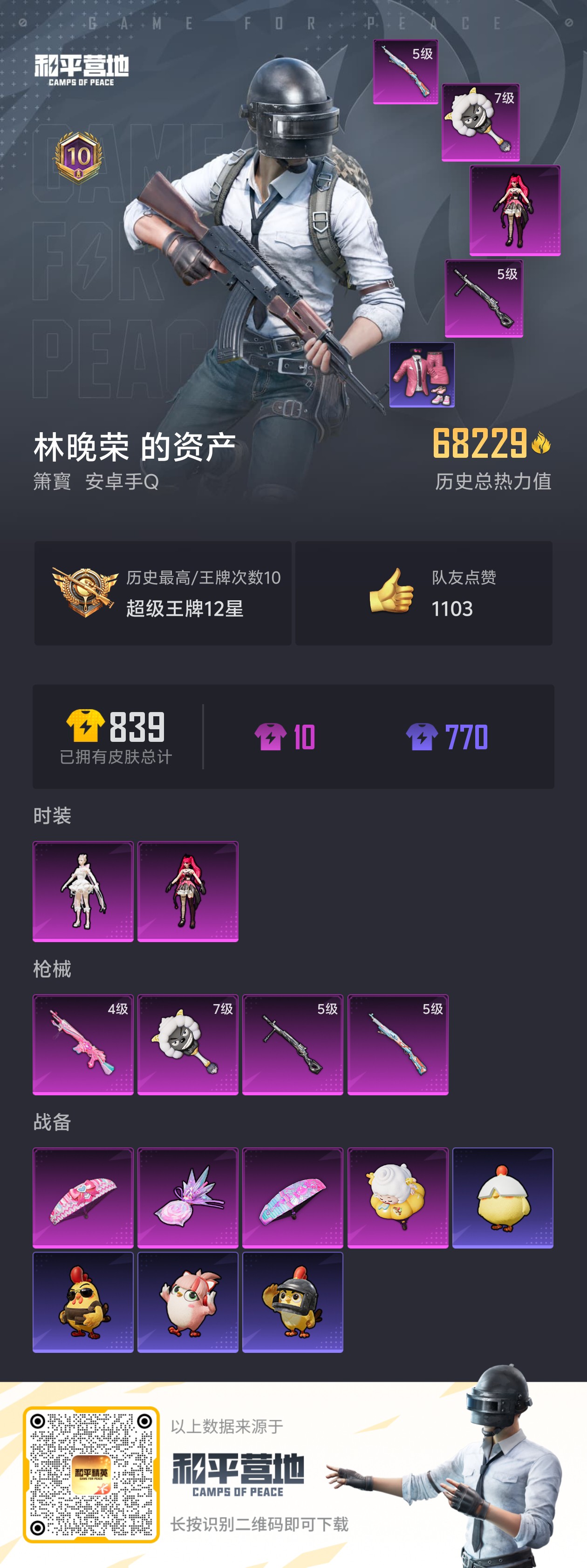 a4236/安卓QQ/热力值:49001,3粉装,3粉枪,5载具,8粉色战备,100套装,134枪械