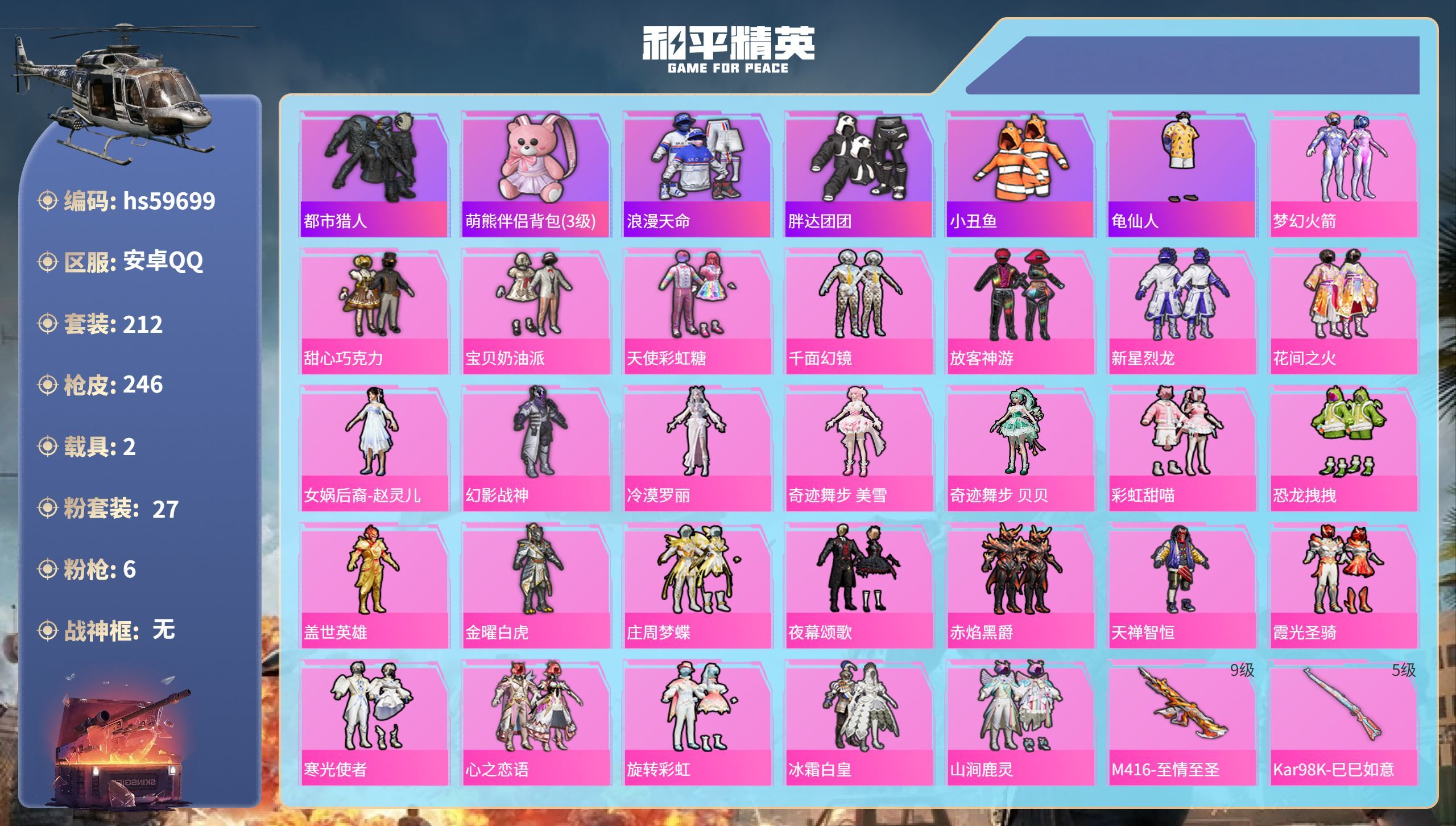 hs59699 安卓手Q-15王牌印记-27粉装-6特效枪-2载具-91552热力值-212套装-2