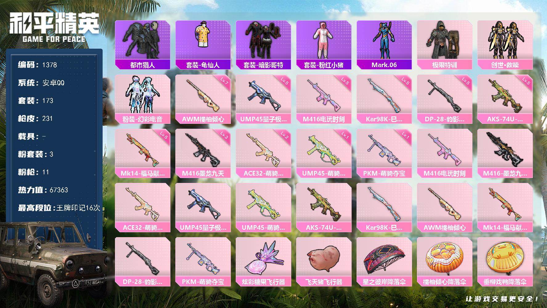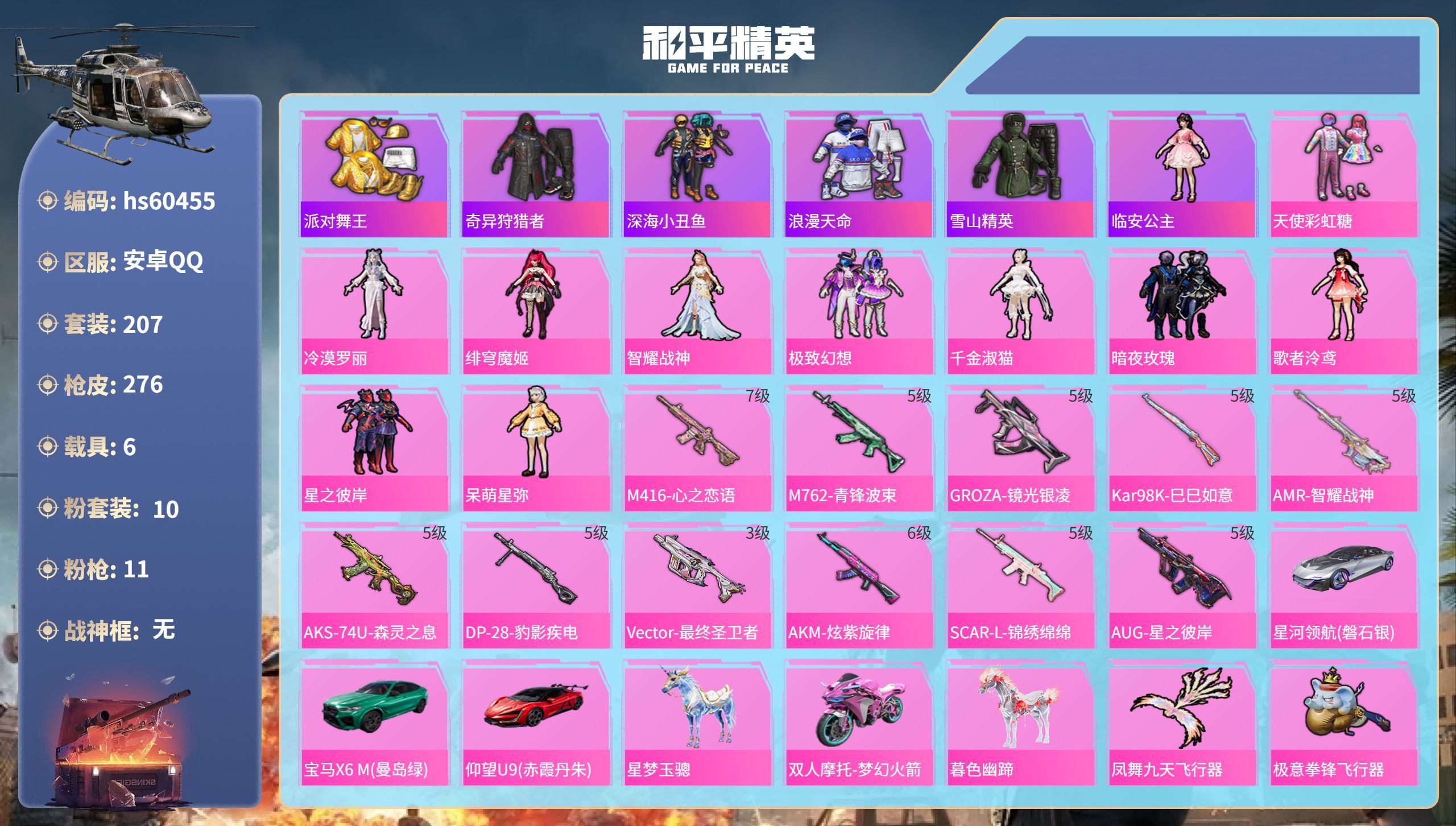 hs60455 安卓手Q-11王牌印记-10粉装-11特效枪-6载具-90031热力值-207套装-
