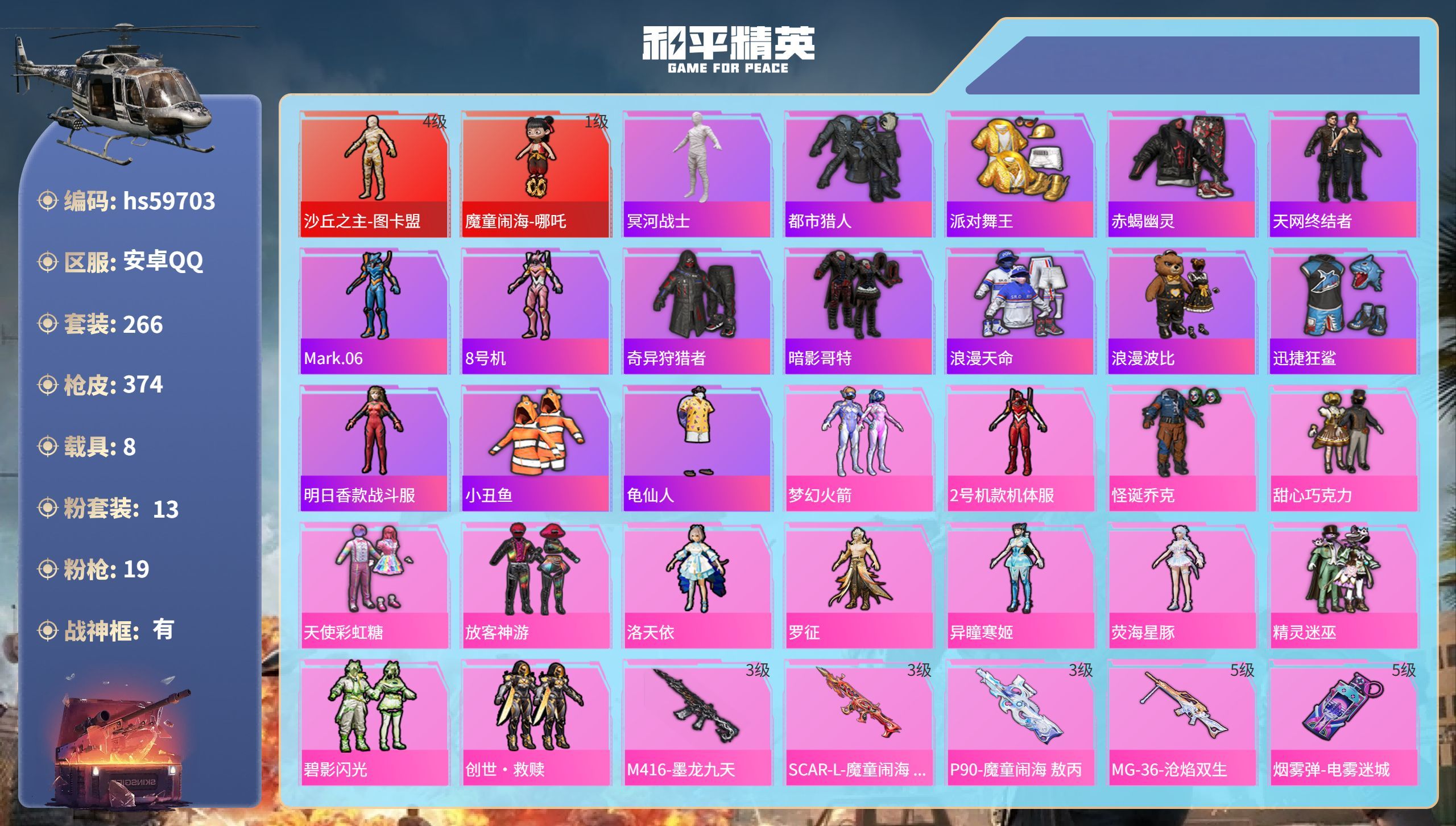 hs59703 安卓手Q-19王牌印记-有战神框-2红装-13粉装-19特效枪-8载具-131002