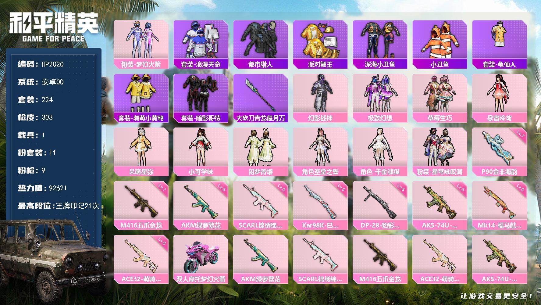 224套装/枪械9/装备382/载具1/战备224/王牌印记21/热力值92621/