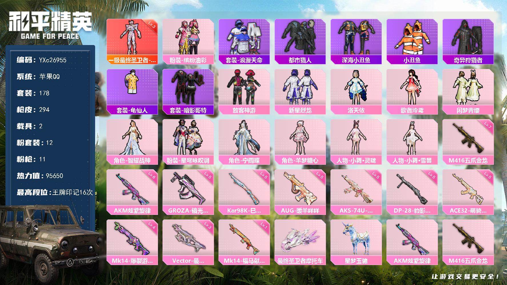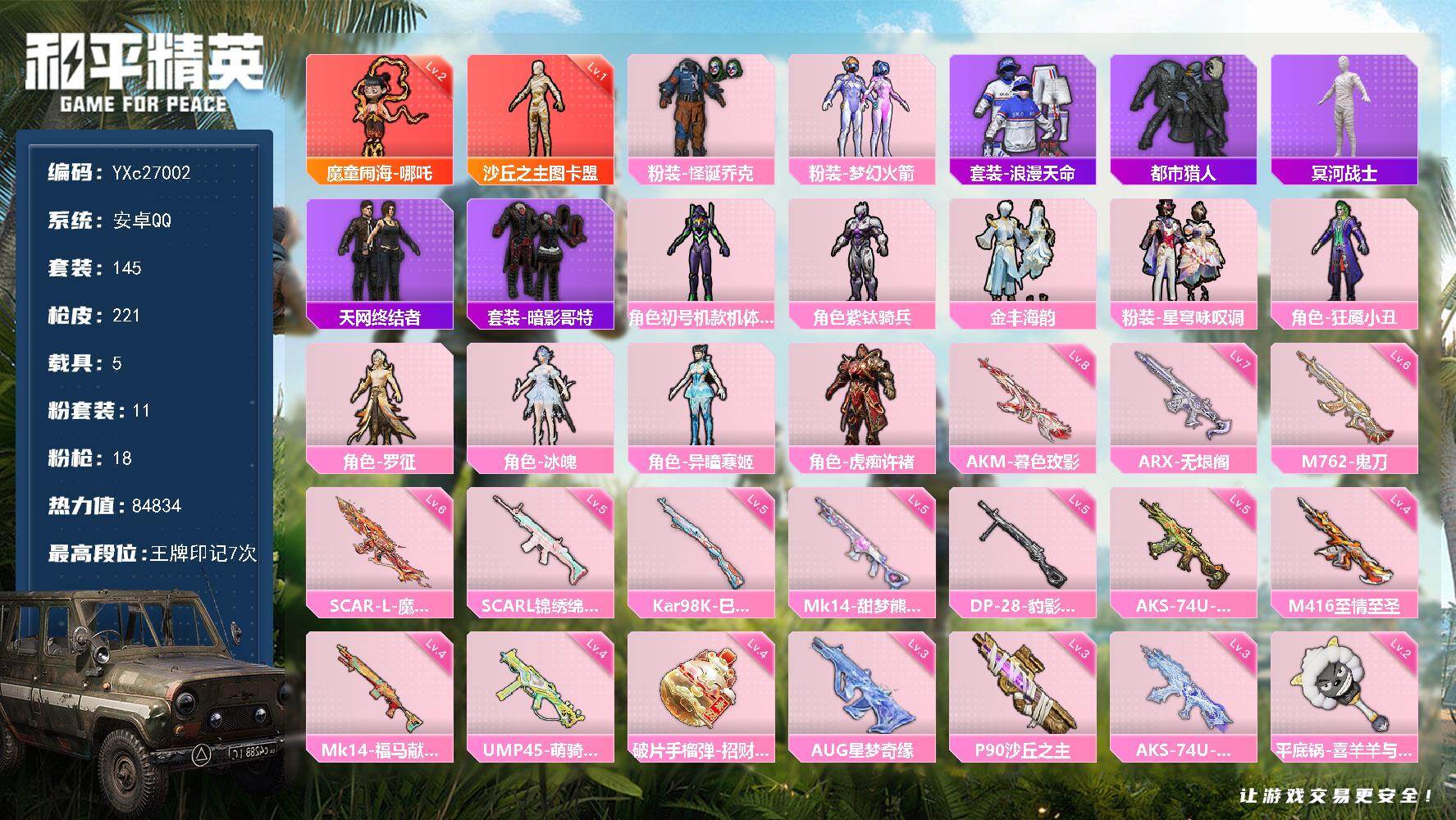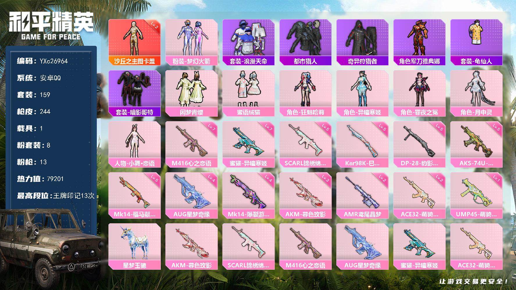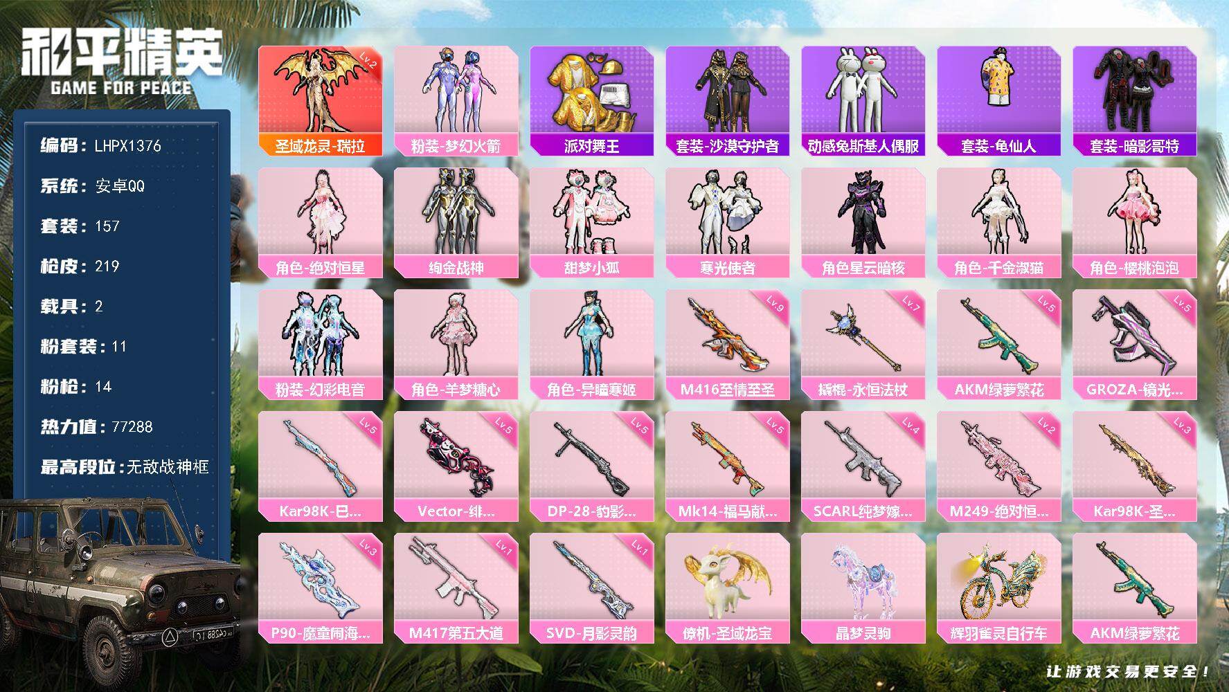 无敌战神框-1神装-11粉装-14特效枪-2载具-9粉色飞行器-77288热力值-13王牌印记-157套装-219枪皮