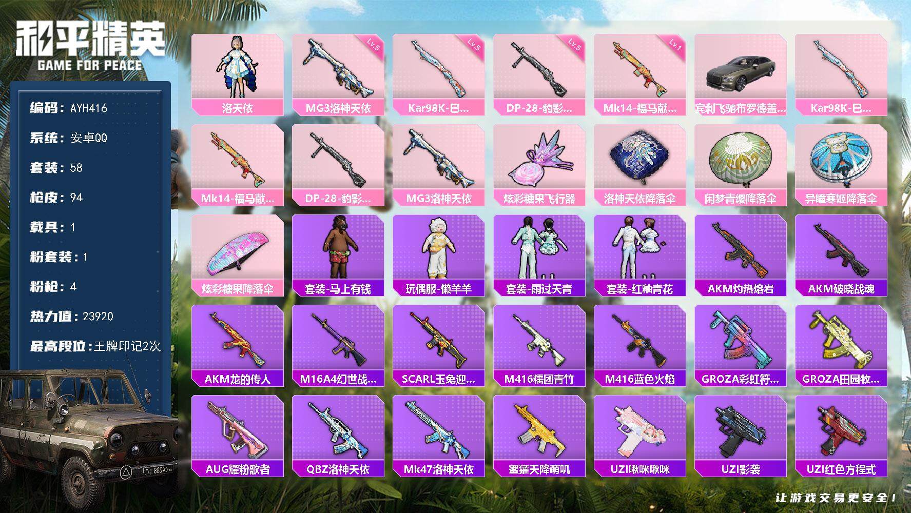 1粉装-4特效枪-1载具-1粉色飞行器-23920热力值-2王牌印记-58套装-94枪皮