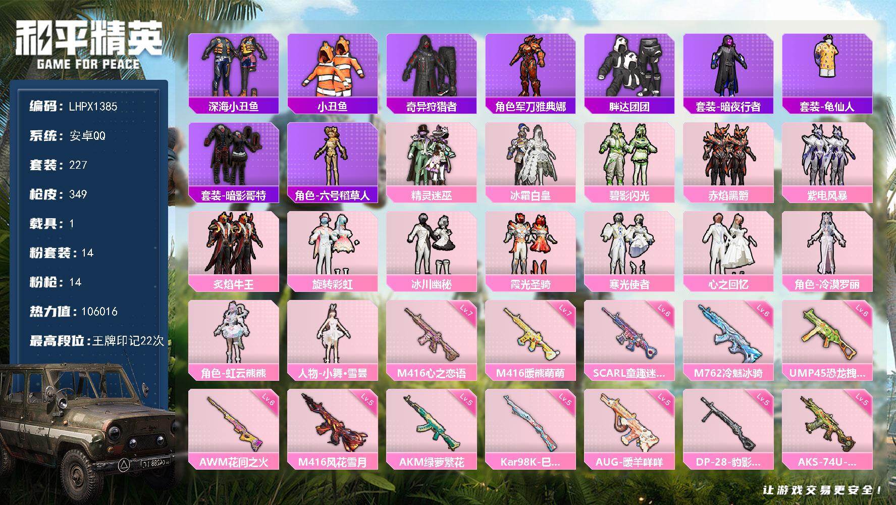 14粉装-14特效枪-1载具-2粉色飞行器-106016热力值-22王牌印记-227套装-349枪皮