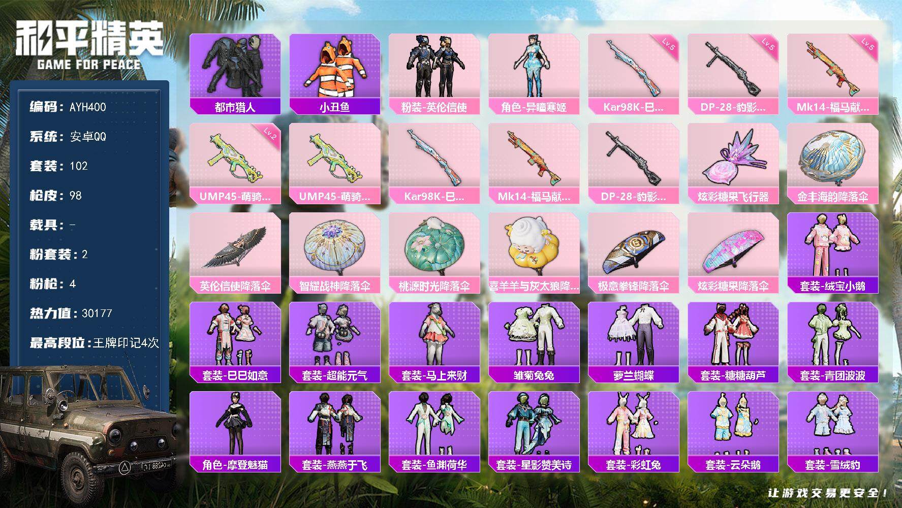 2粉装-4特效枪-0载具-1粉色飞行器-30177热力值-4王牌印记-102套装-98枪皮