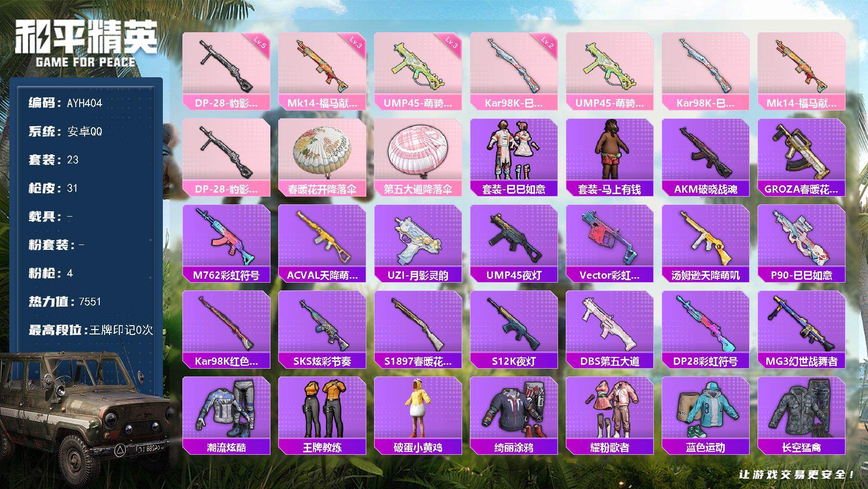 0粉装-4特效枪-0载具-0粉色飞行器-7551热力值-2王牌印记-