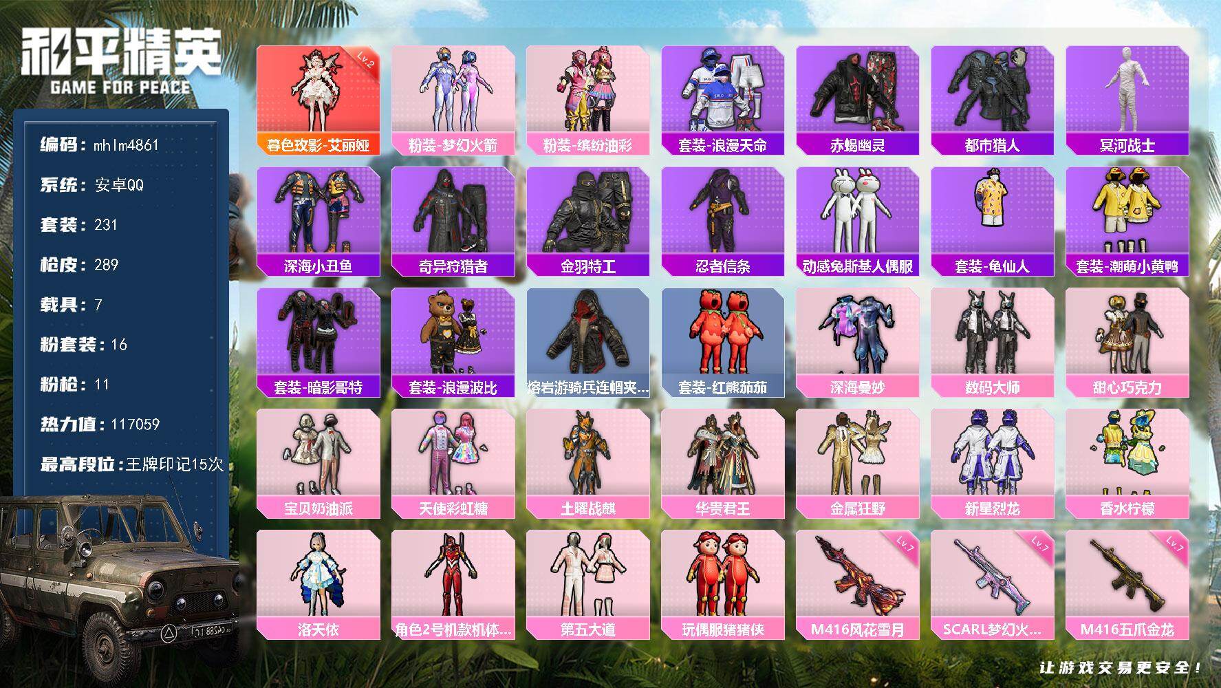 1神装-16粉装-11特效枪-7载具-5粉色飞行器-117059热力值-15王牌印记-231套装-289枪皮