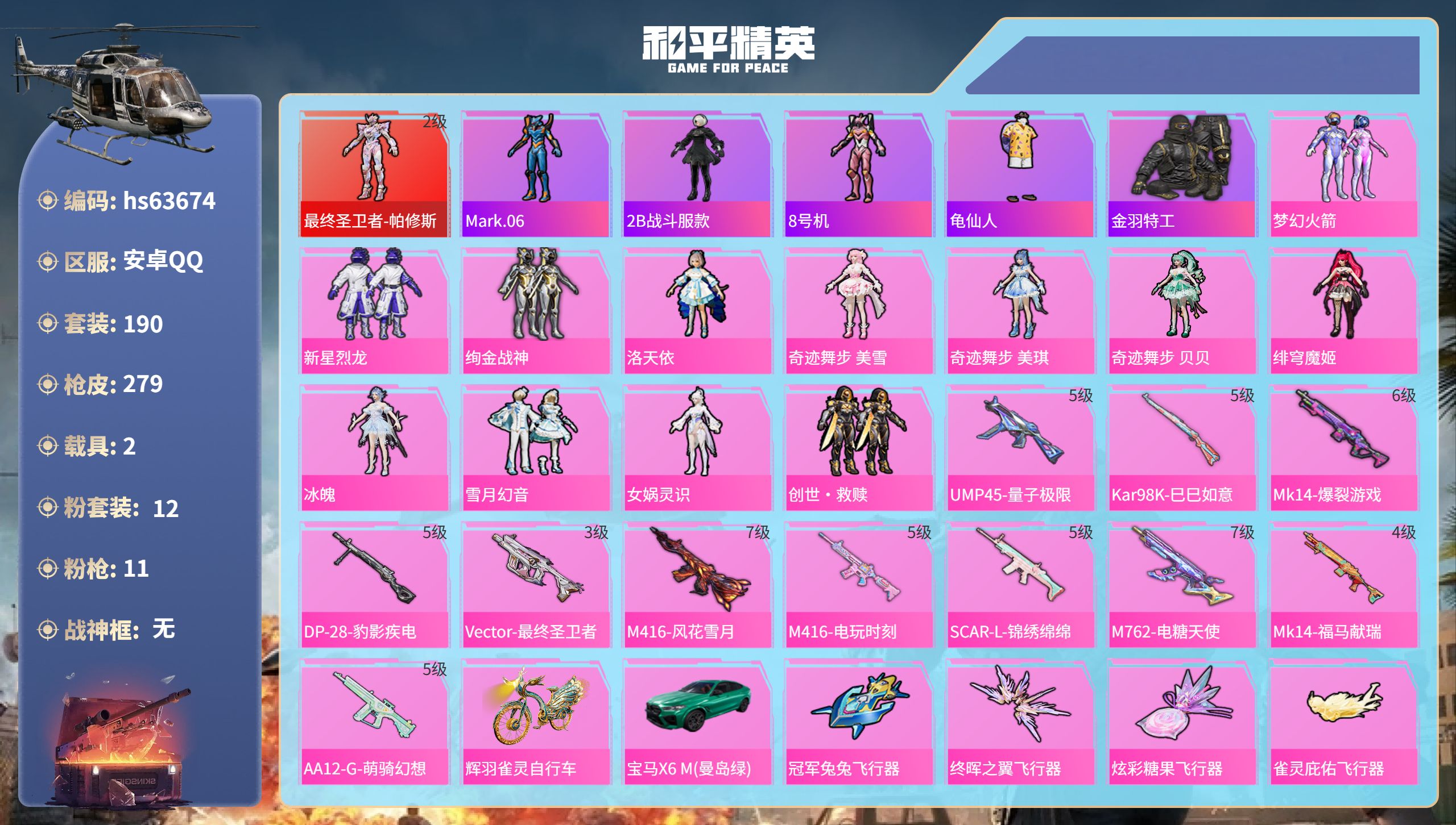 安卓手Q-11王牌印记-10粉装-12特效枪-2载具-66490