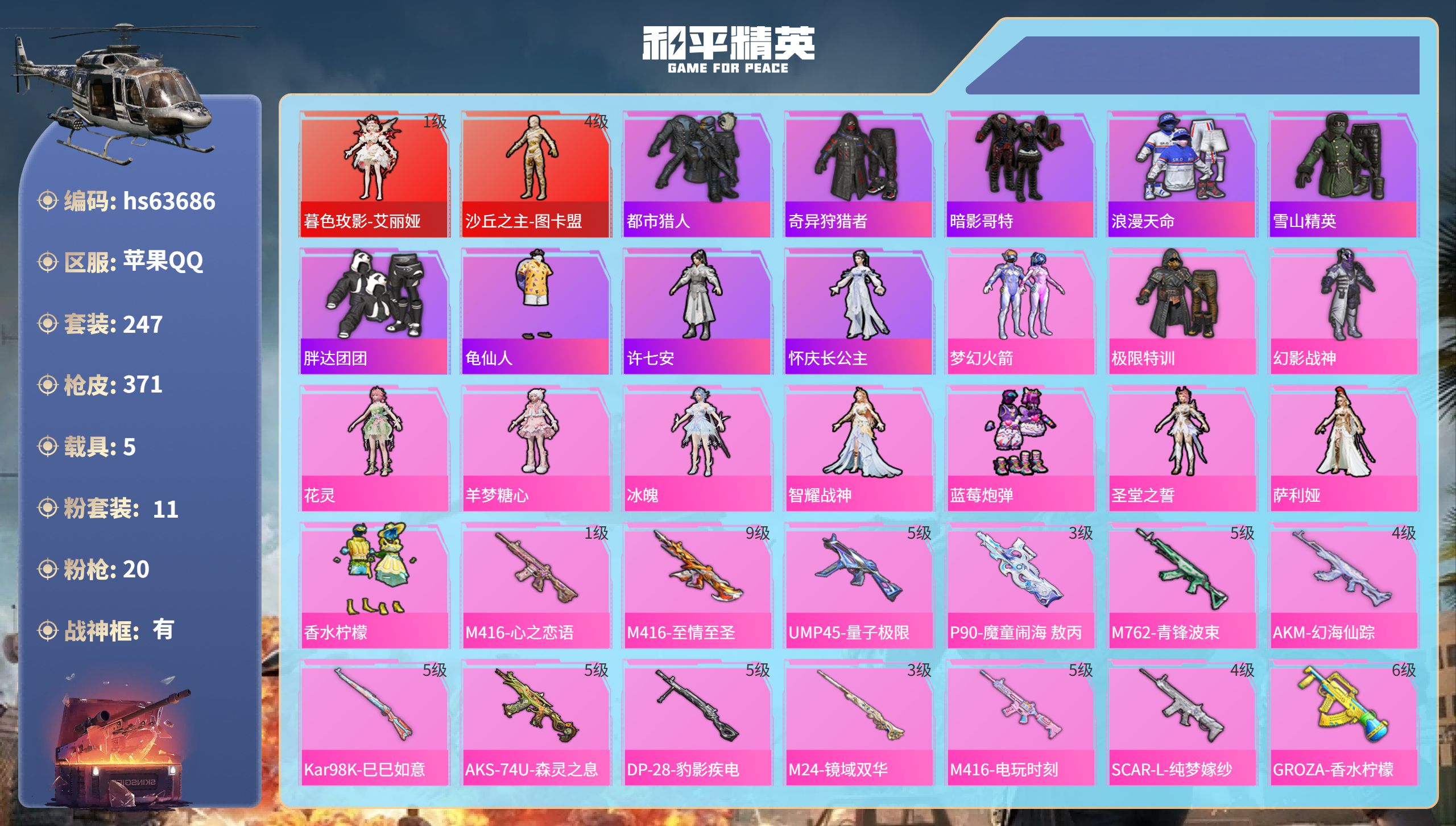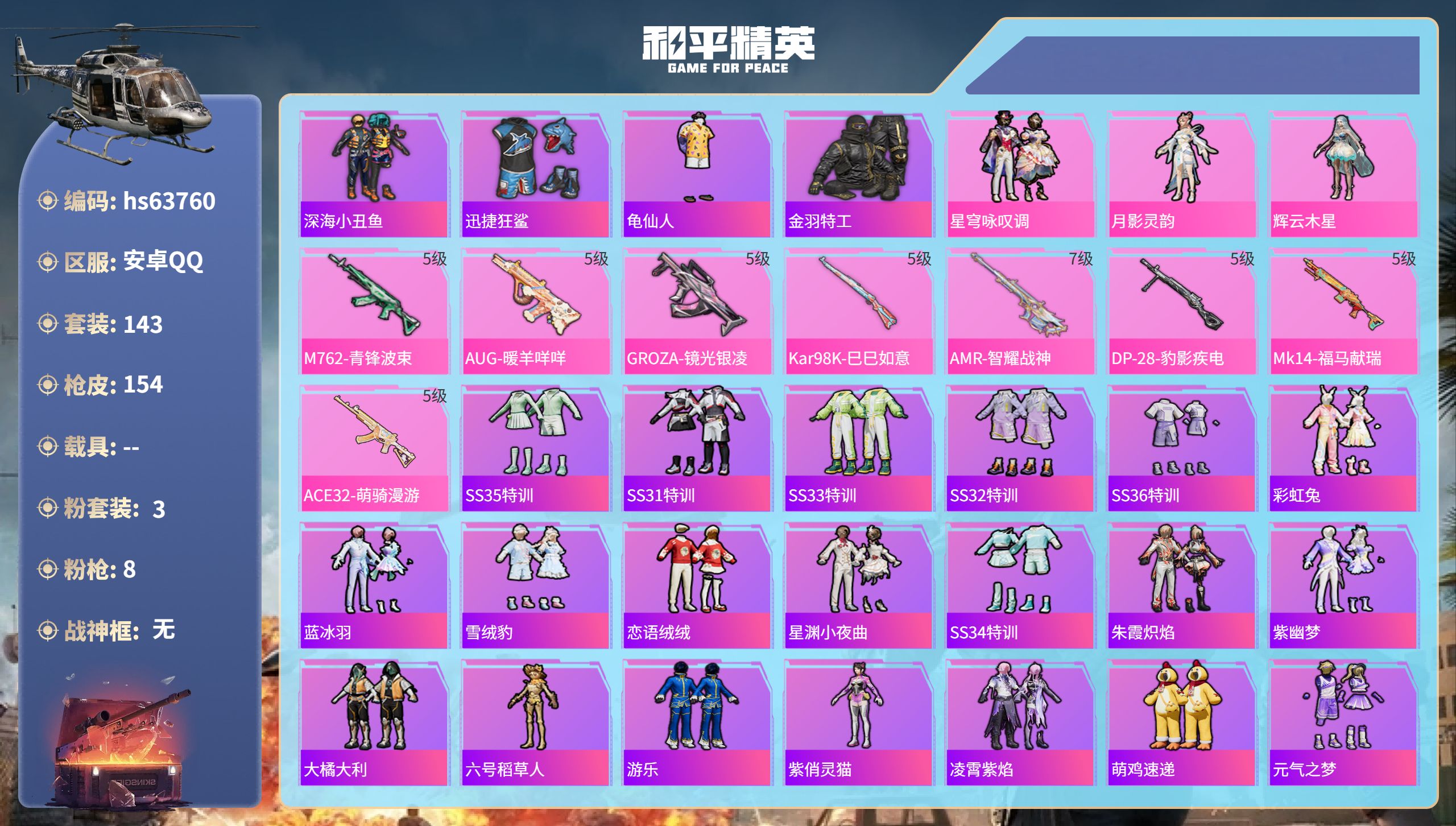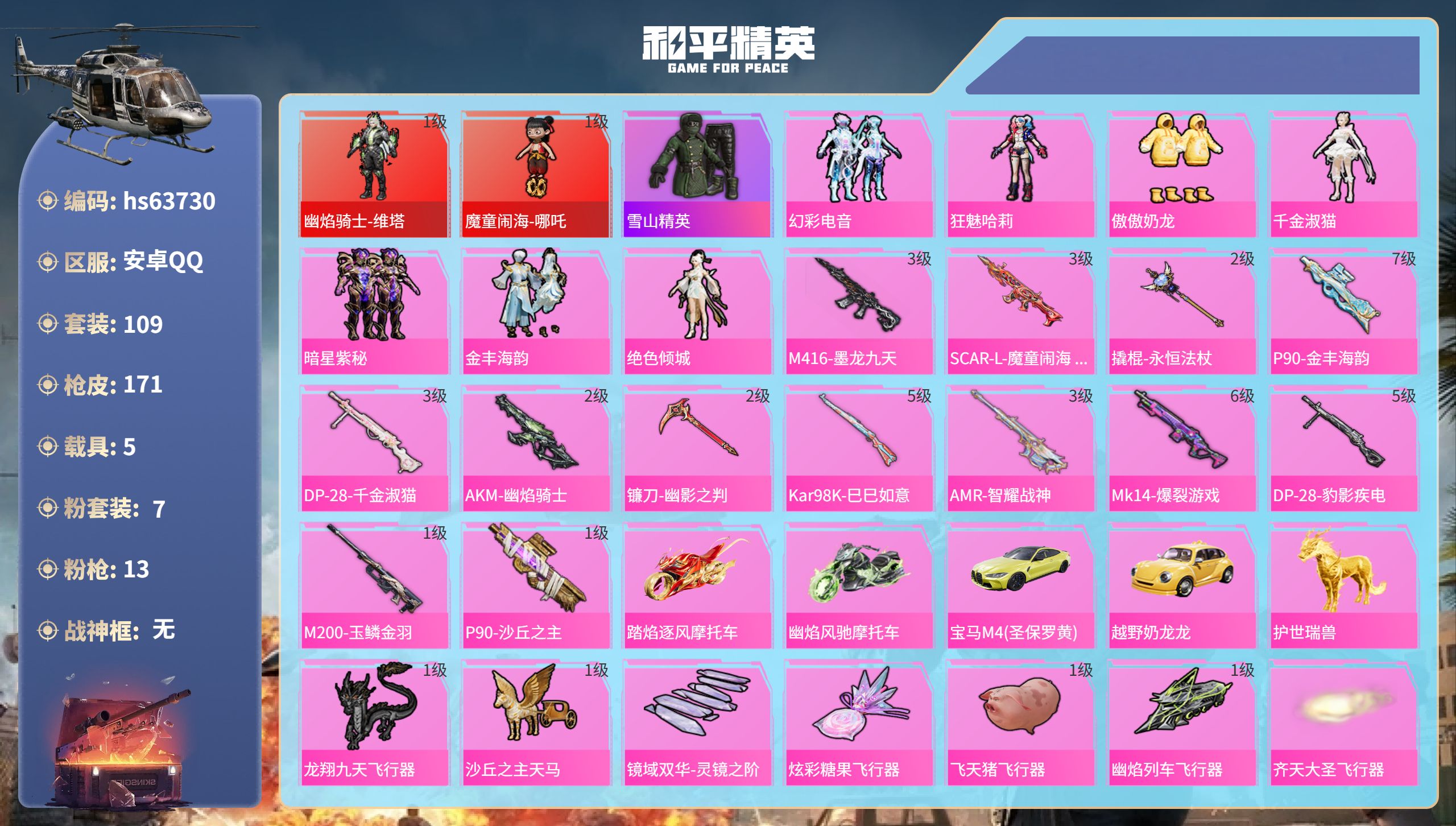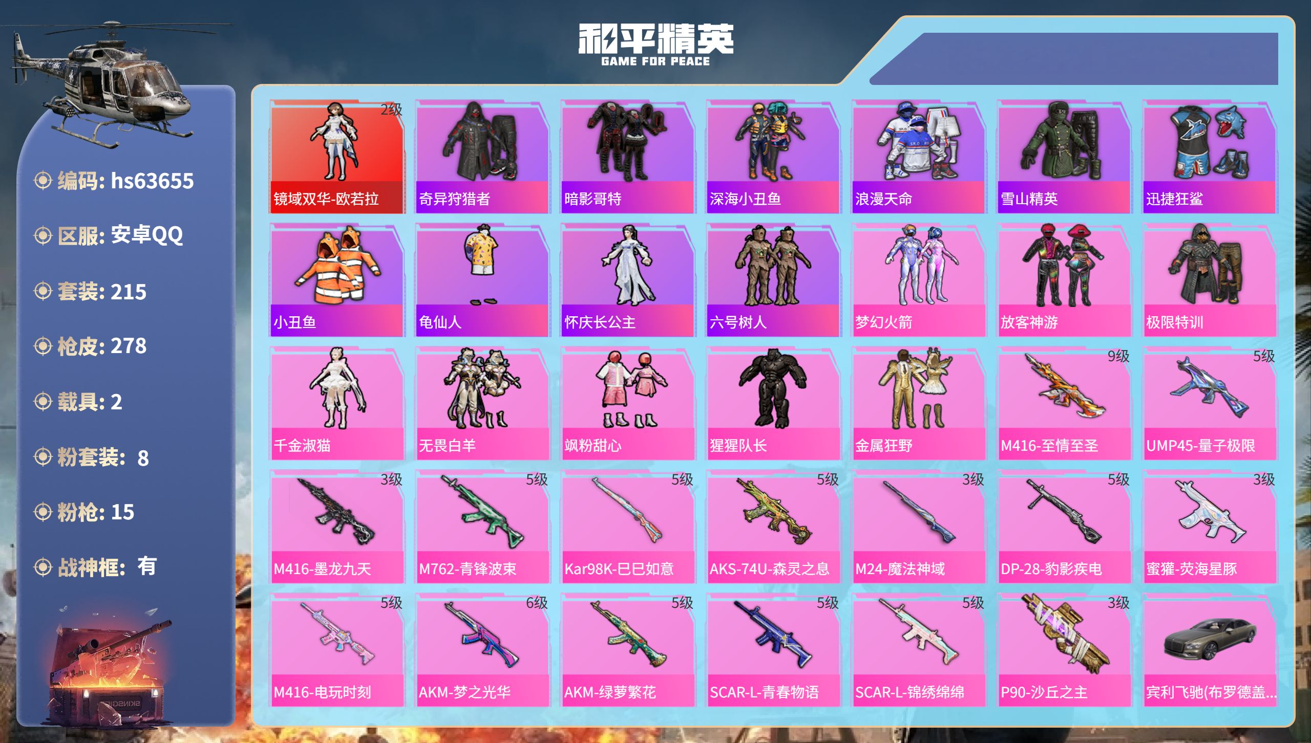 无敌战神框-1神装-5粉装-9特效枪-1载具-2粉色飞行器-67554热力值-17王牌印记-137套装-215枪皮