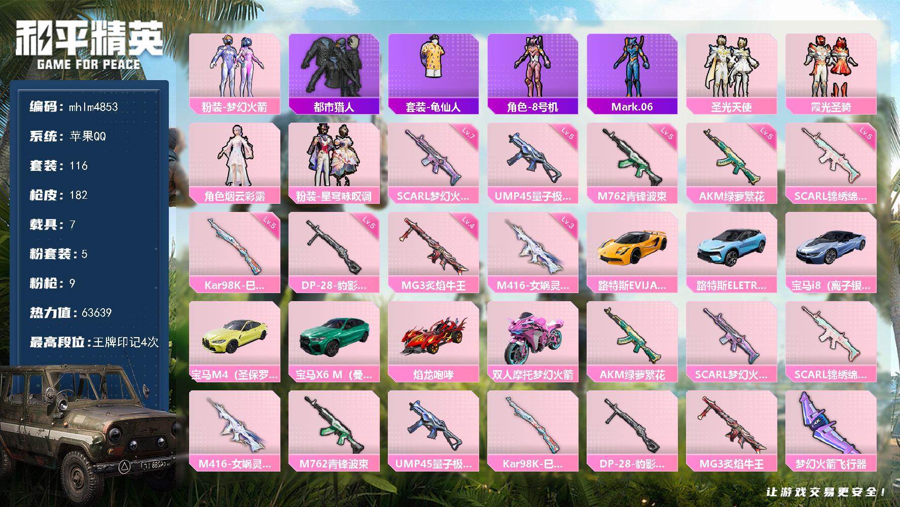 5粉装-9特效枪-7载具-2粉色飞行器-63639热力值-4王牌印记-116套装-182枪皮