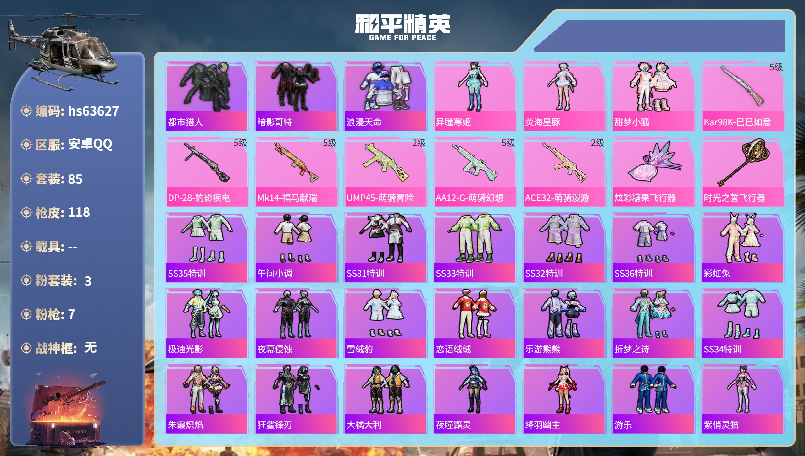 安卓 手Q-3粉装-9特效枪-0载具-3粉色飞行器-37710热力值-7王牌印记