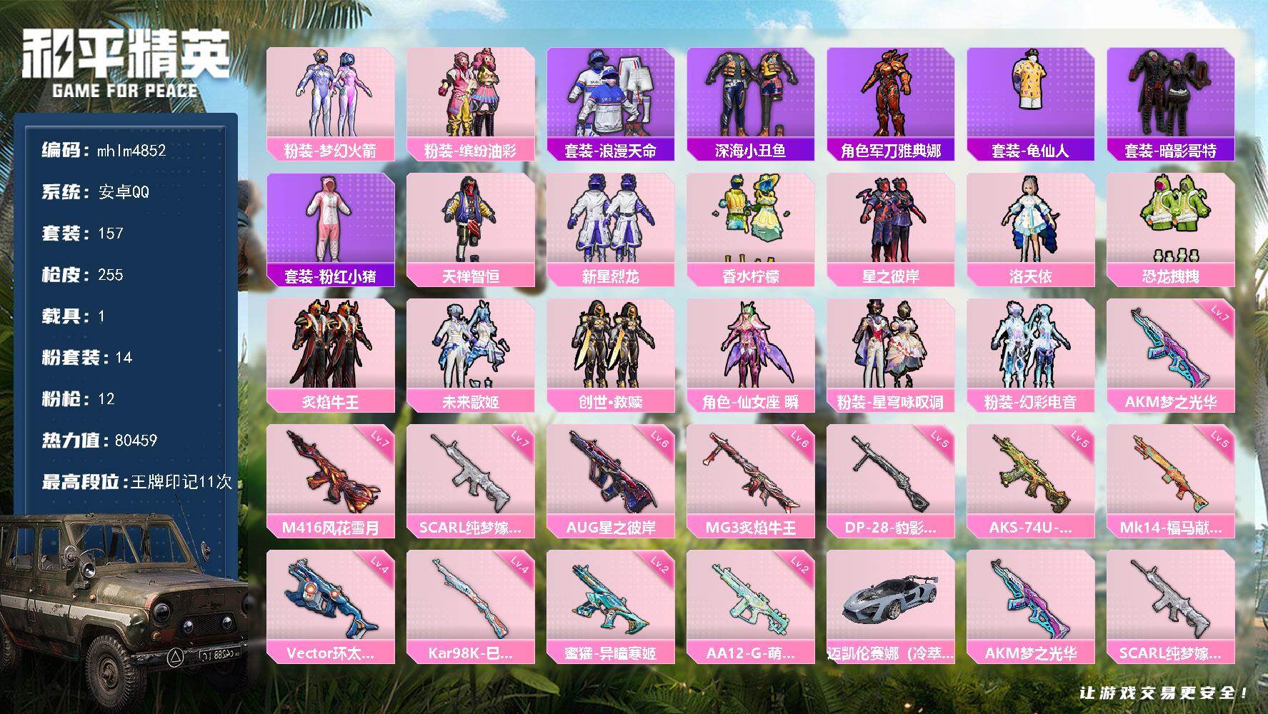 14粉装-12特效枪-1载具-4粉色飞行器-80459热力值-11王牌印记-157套装-255枪皮