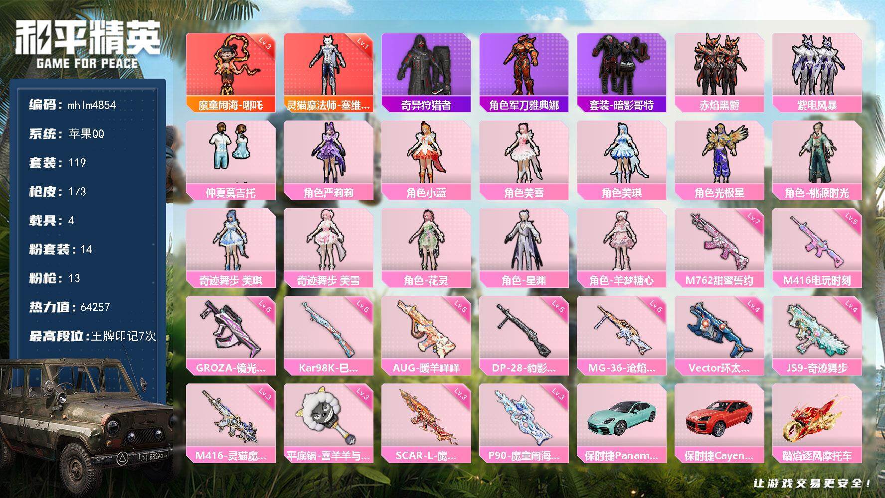 2神装-14粉装-13特效枪-4载具-4粉色飞行器-64257热力值-7王牌印记-119套装-173枪皮