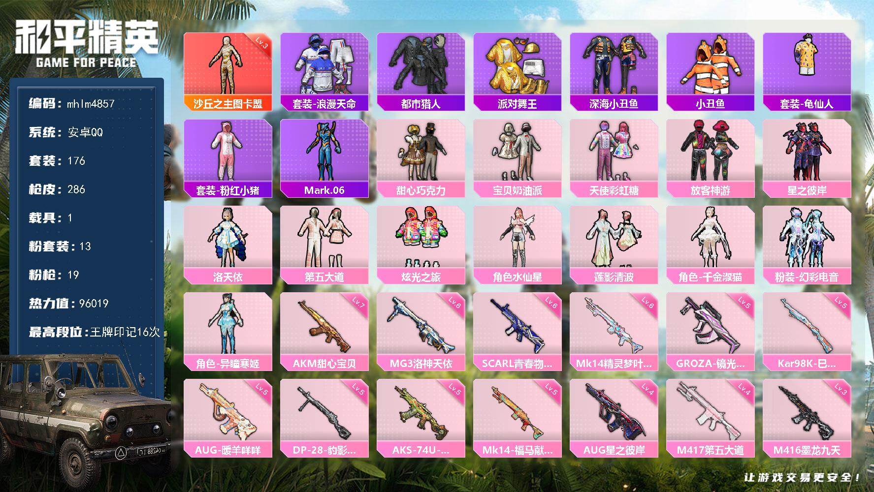 安卓手Q-0王牌印记-2红装-7粉装-13特效枪-5载具-616