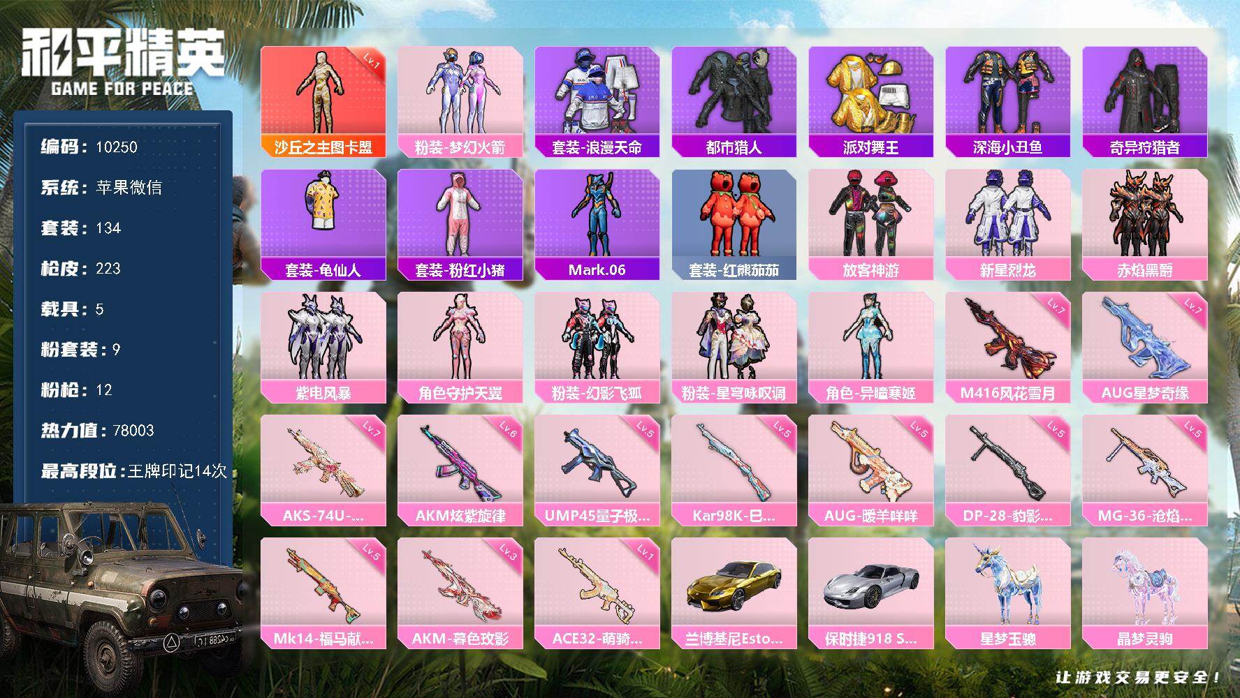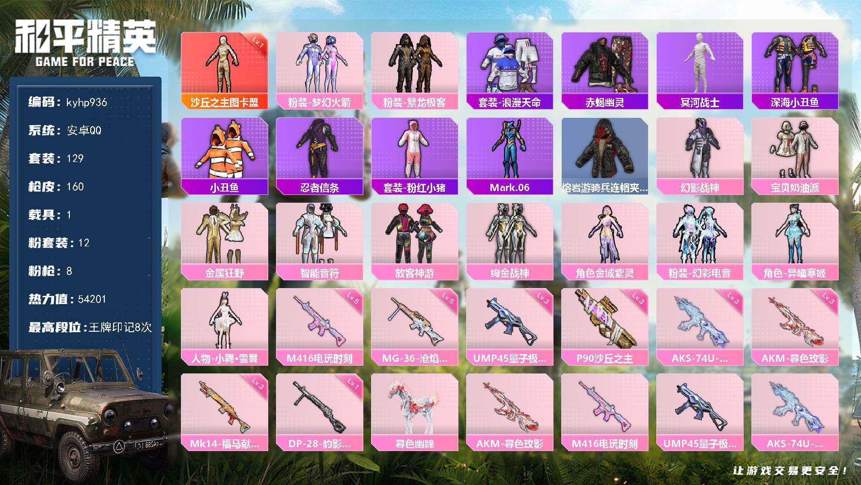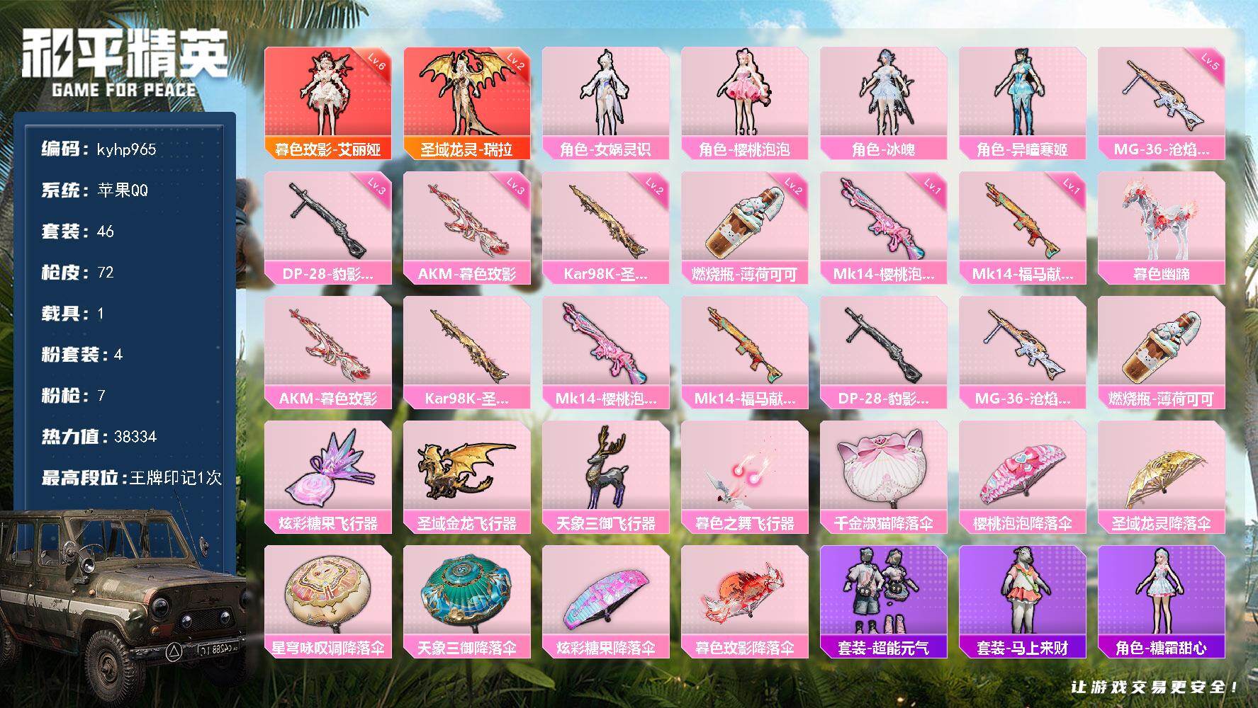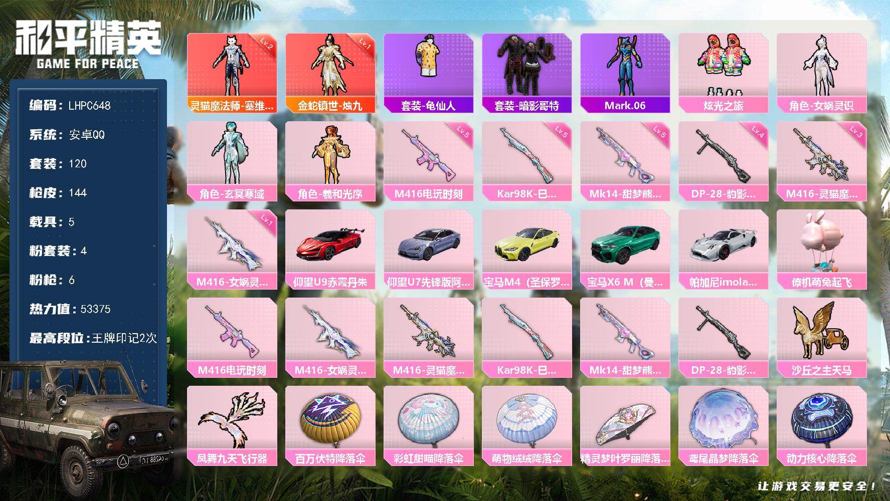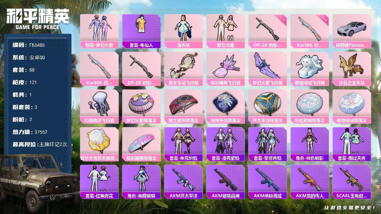 2神装-4粉装-6特效枪-5载具-2粉色飞行器-53375热力值-2王牌印记-120套装-144枪皮
