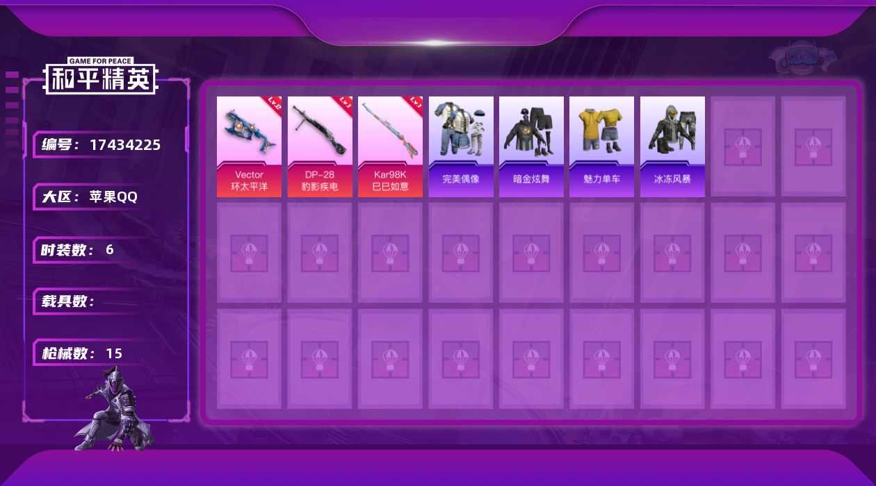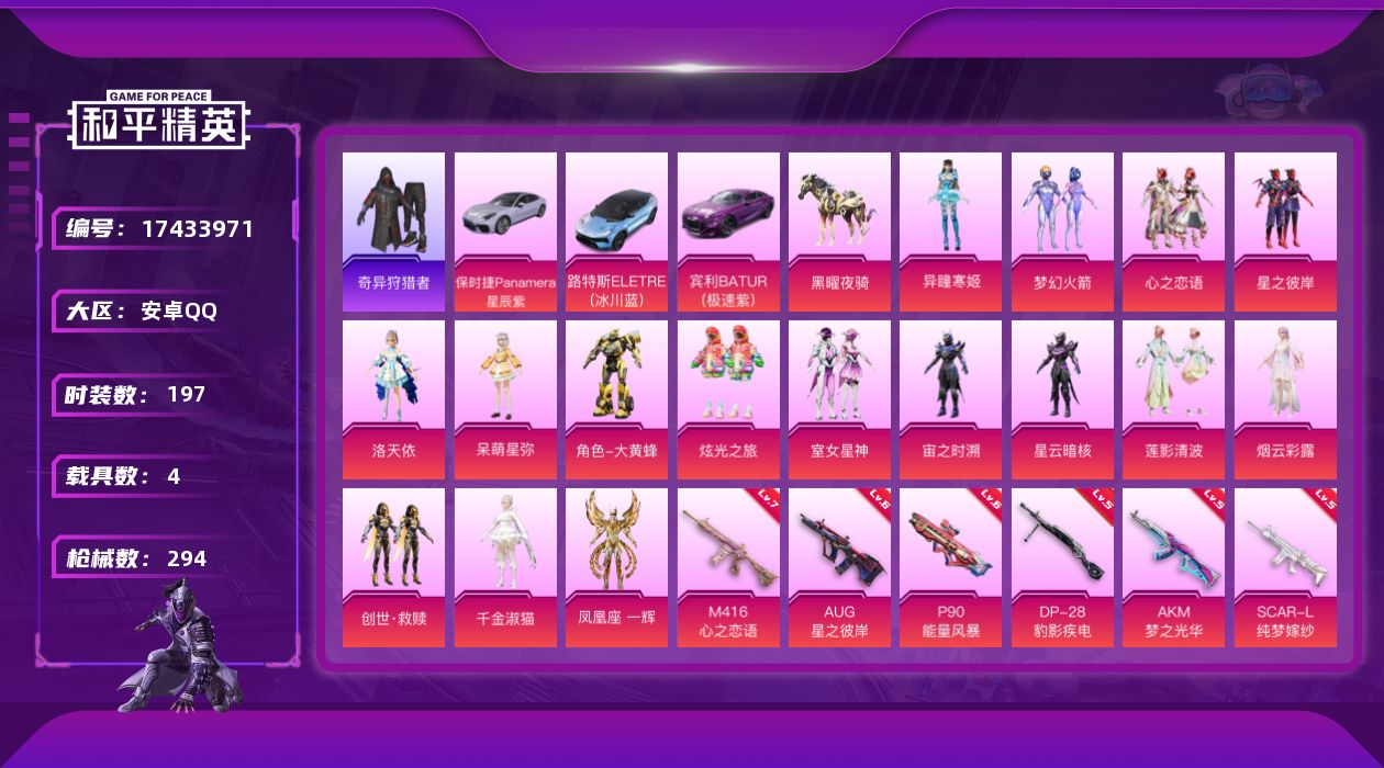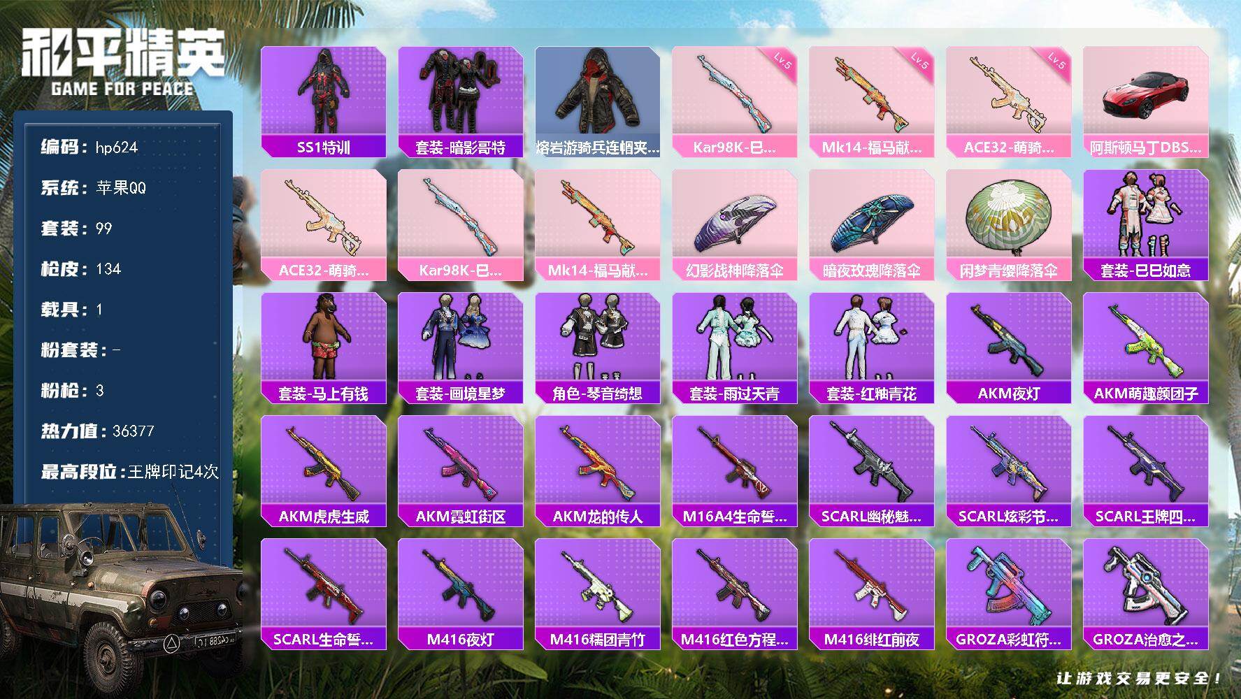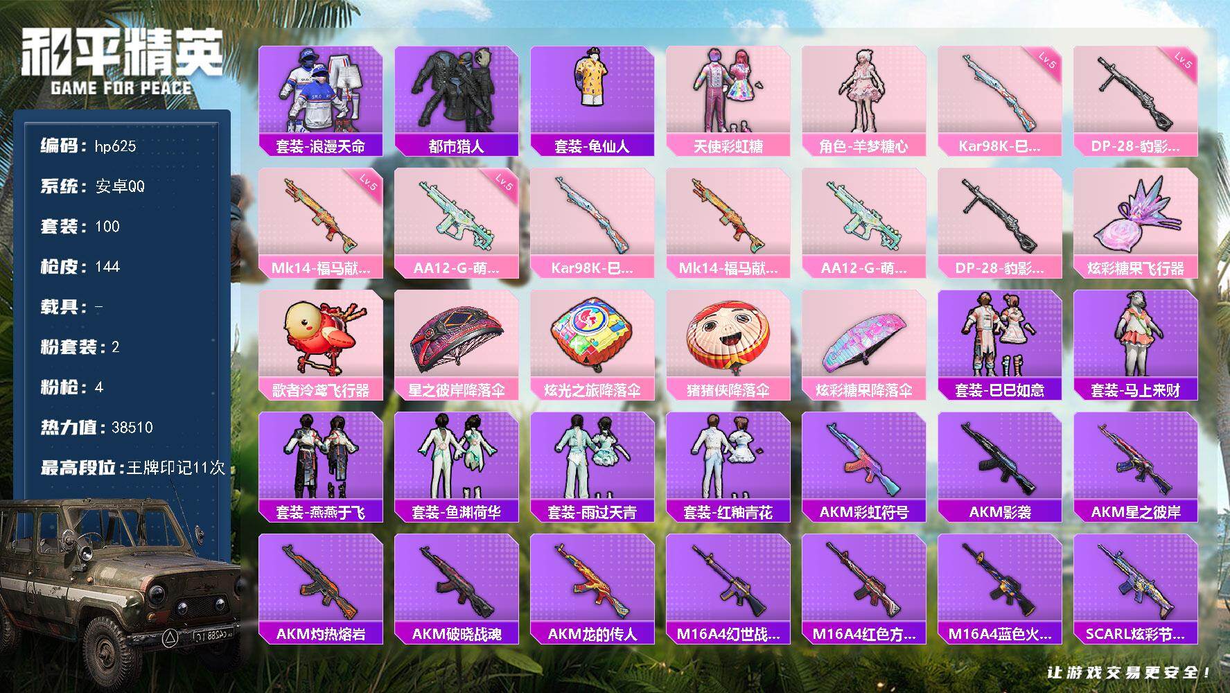 2神装-4粉装-6特效枪-5载具-2粉色飞行器-53375热力值-2王牌印记-120套装-144枪皮