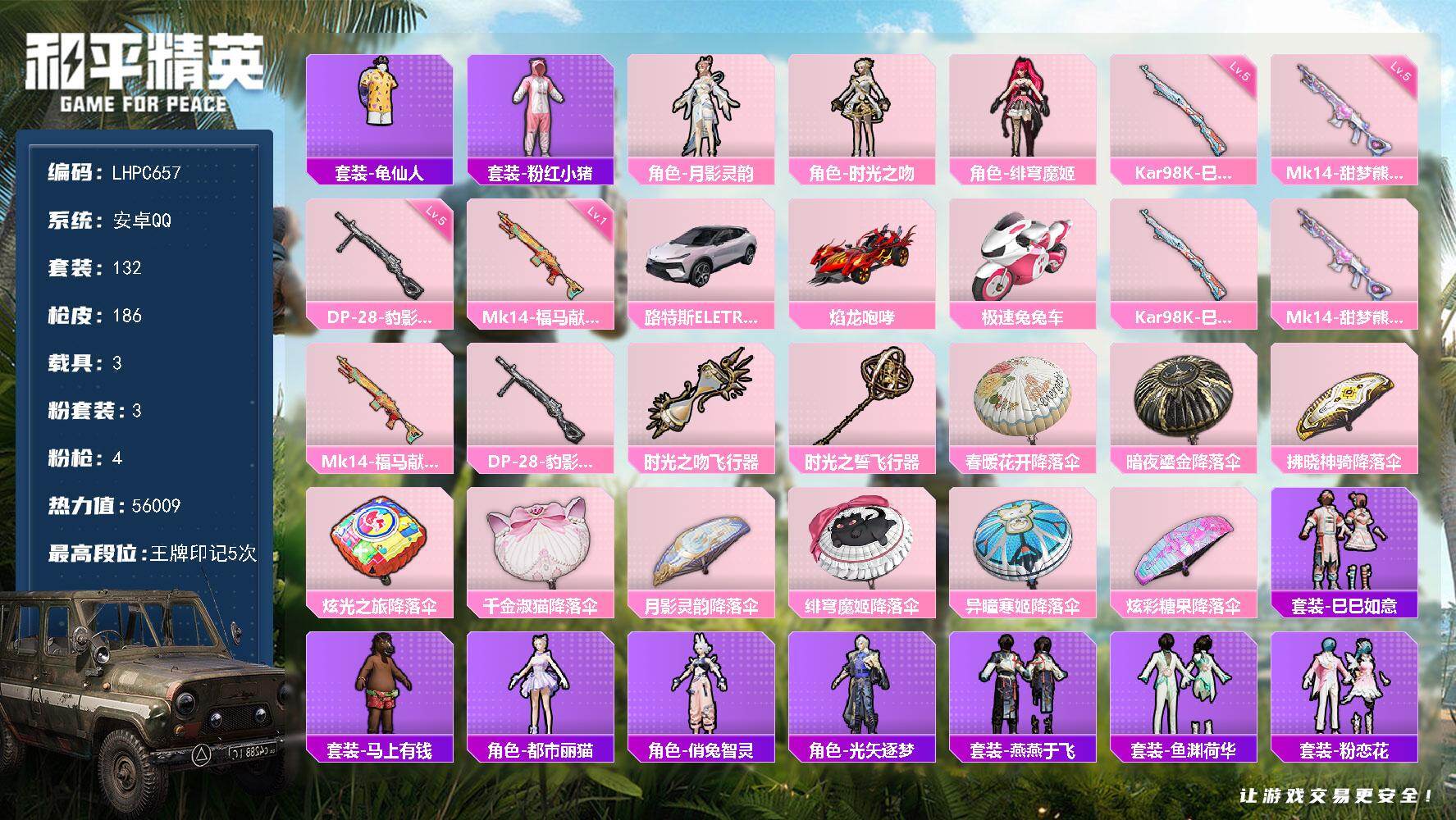 3粉装-4特效枪-3载具-2粉色飞行器-56009热力值-5王牌印记-132套装-186枪皮