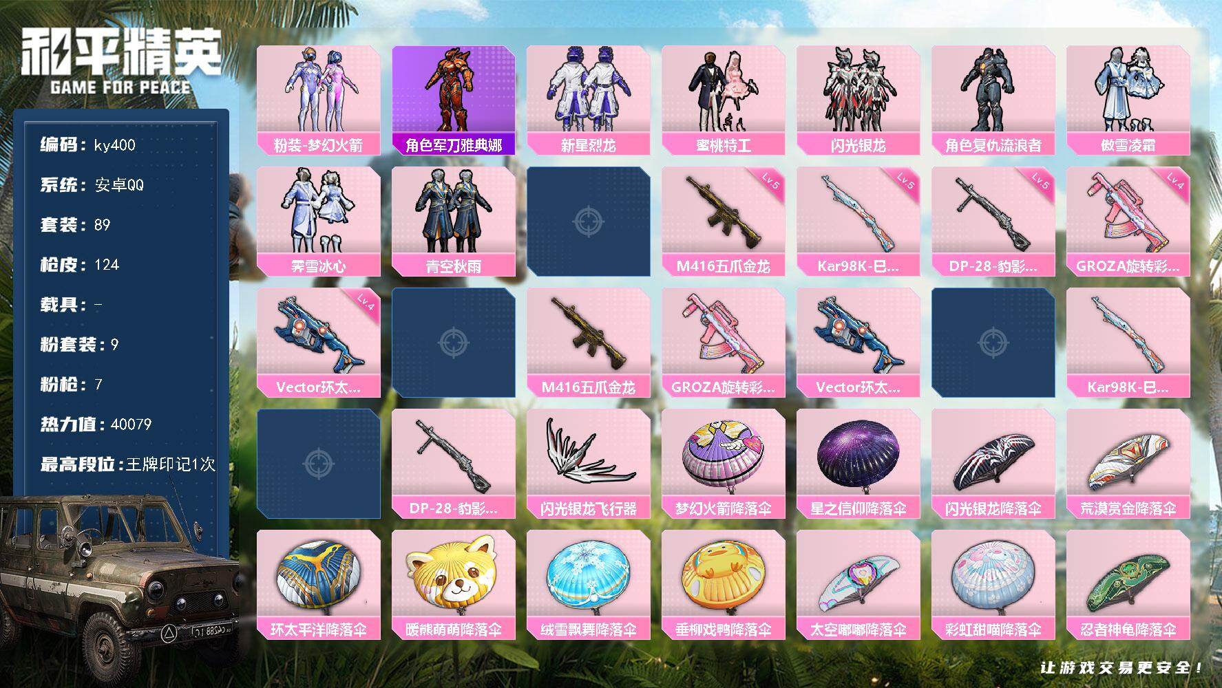 9粉装-7特效枪-0载具-1粉色飞行器-40079热力值-1王牌印记-89套装-124枪皮