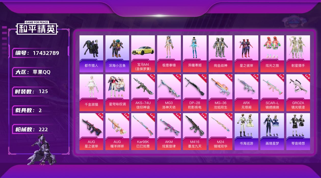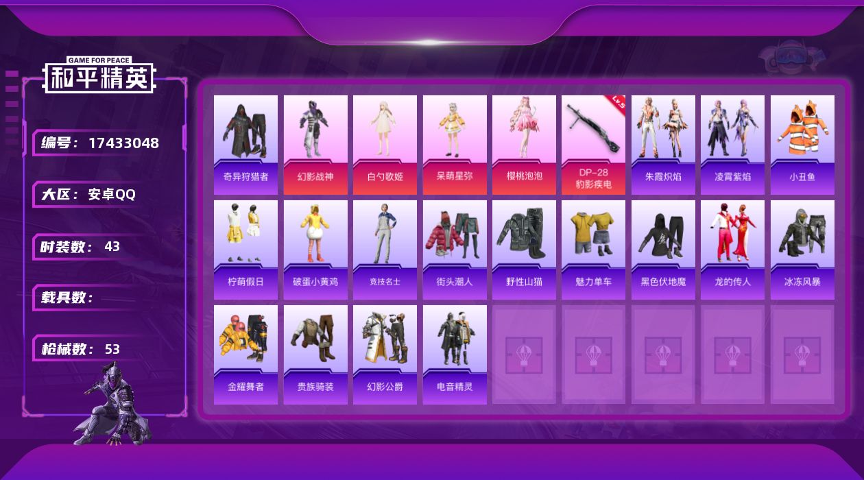 2神装-10粉装-10特效枪-0载具-6粉色飞行器-110580热力值-21王牌印记-260套装-318枪皮