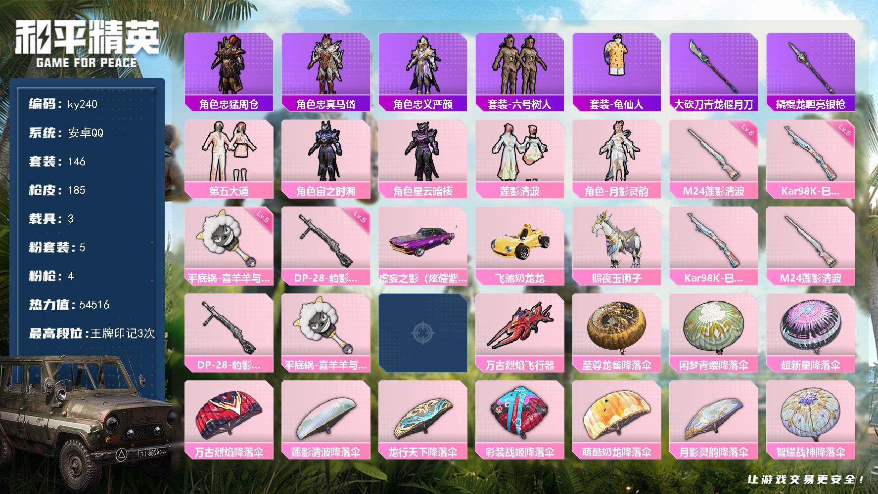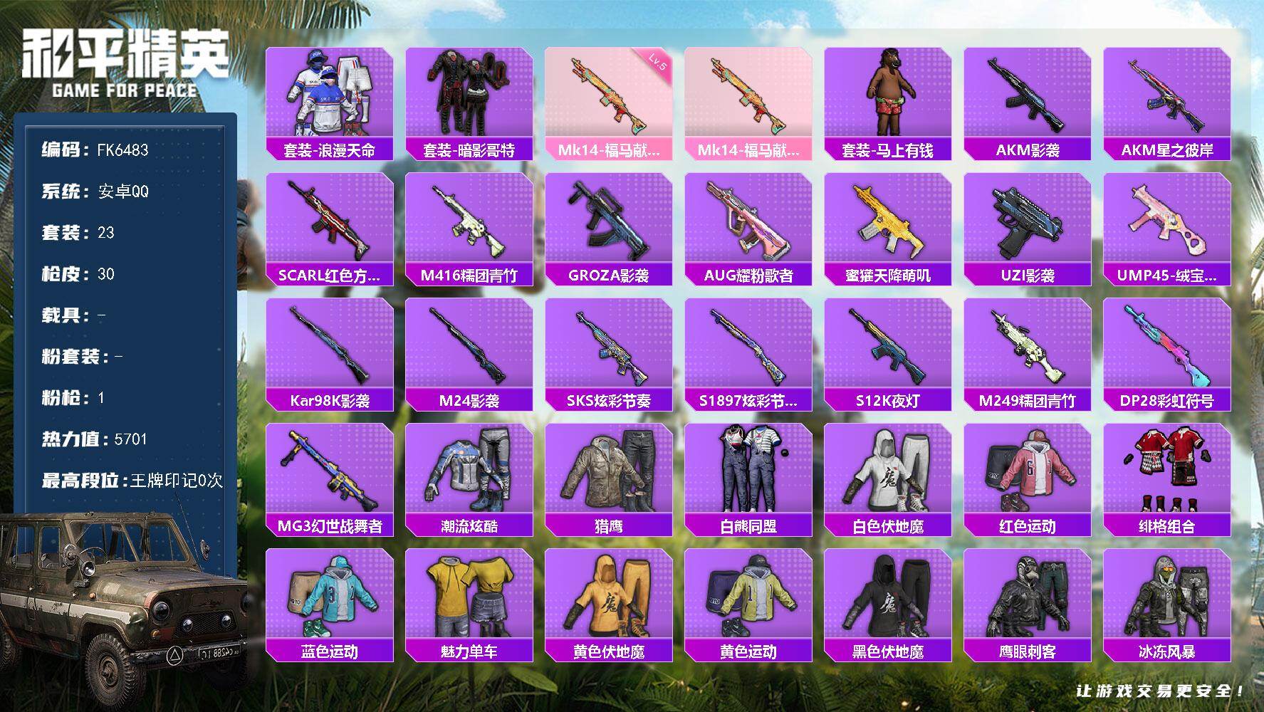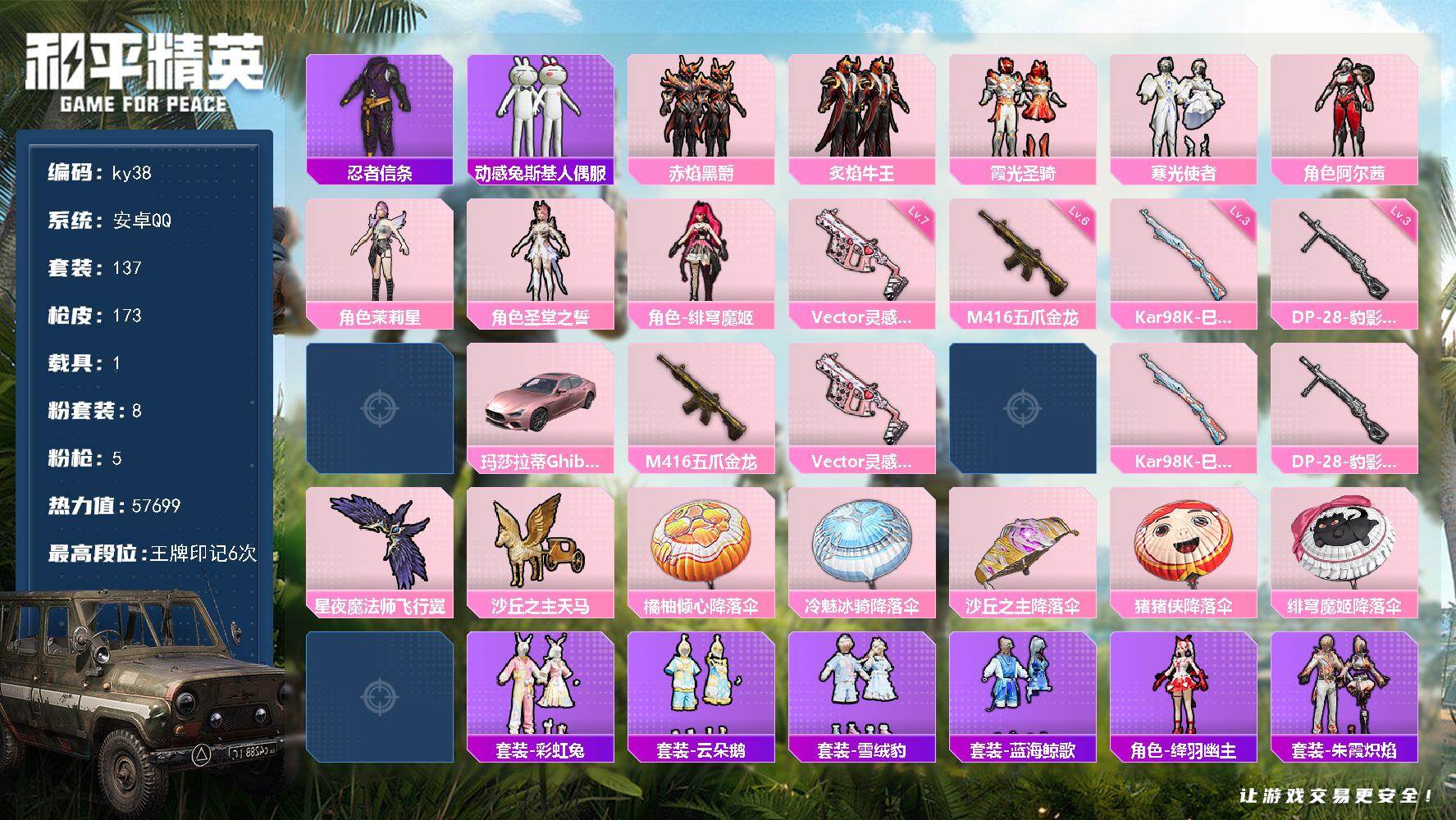 hs63058 安卓手Q-7王牌印记-2粉装-10特效枪-1载具-59395热力值-142套装-18