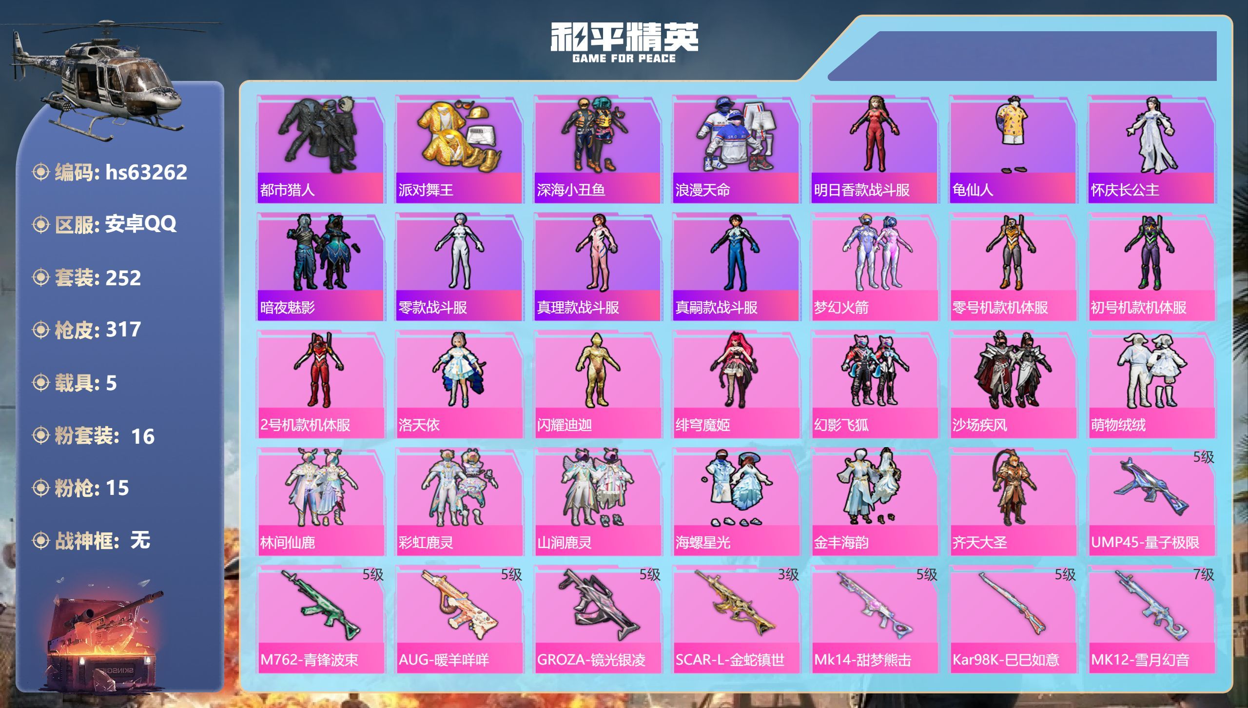 hs63262 安卓手Q-18王牌印记-16粉装-15特效枪-5载具-113597热力值-252套装