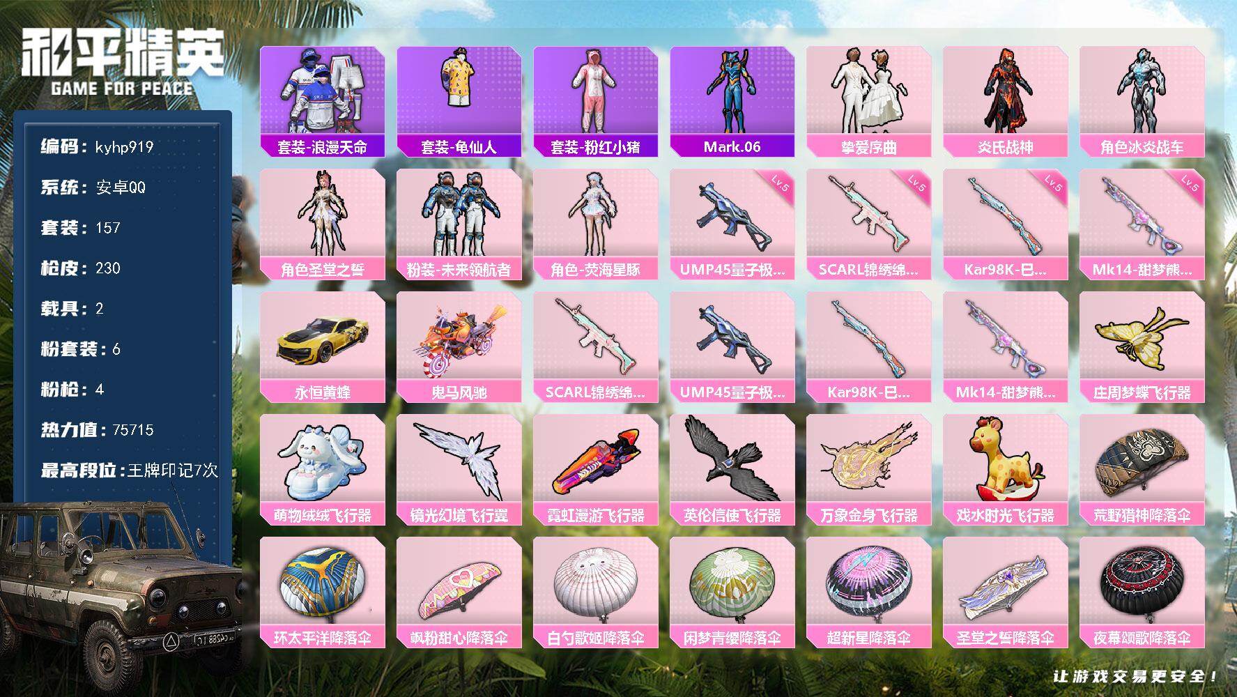 6粉装-4特效枪-2载具-8粉色飞行器-75715热力值-7王牌印记-157套装-230枪皮