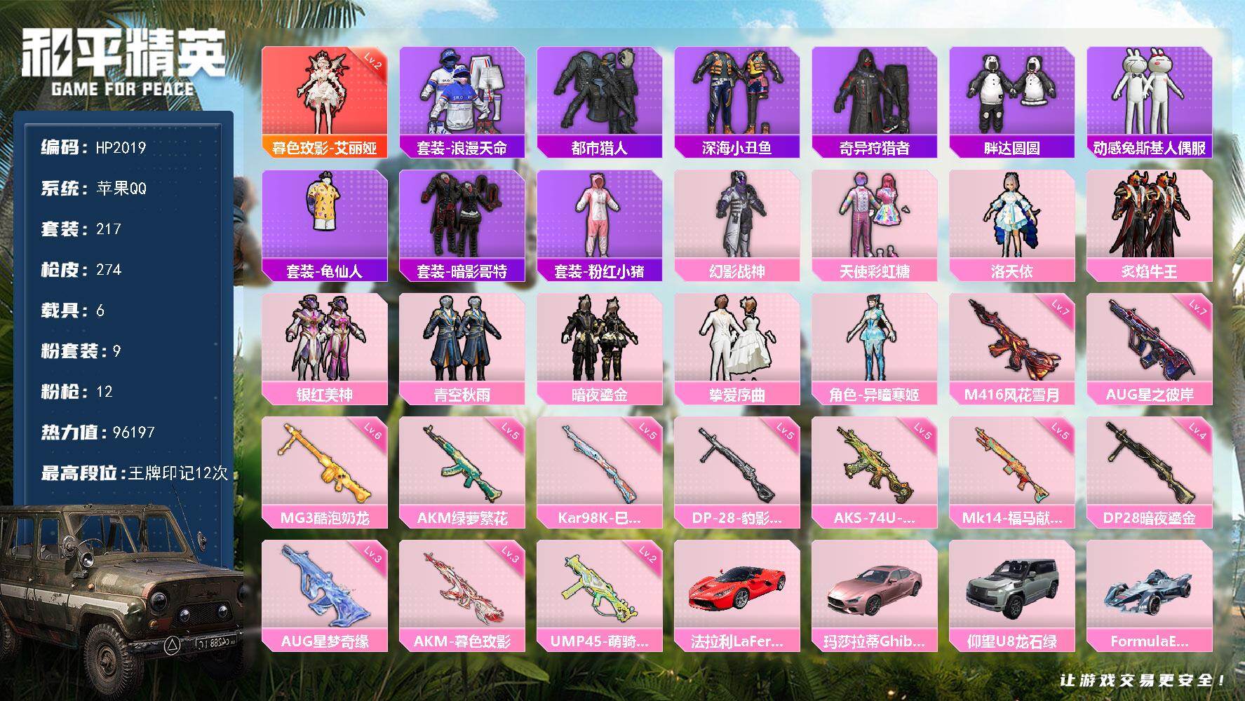 217套装/枪械12/装备328/载具6/战备199/王牌印记12/热力值96197/