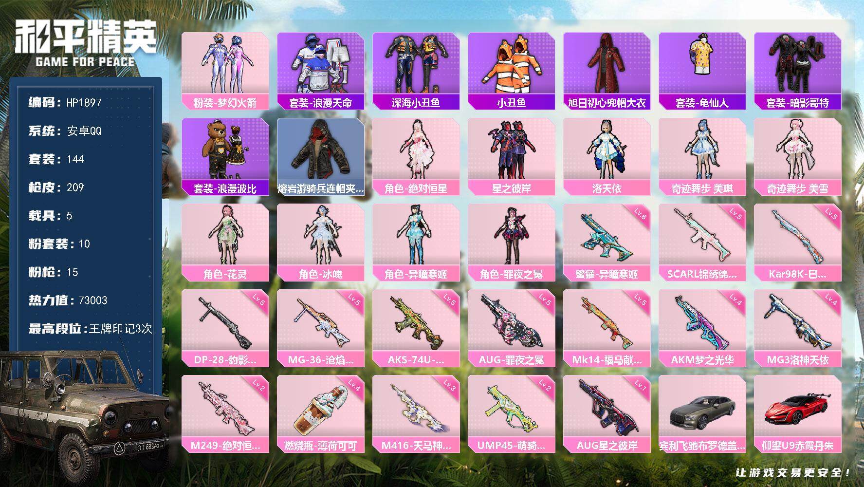144套装/枪械15/装备267/载具5/战备148/王牌印记3/热力值73003/