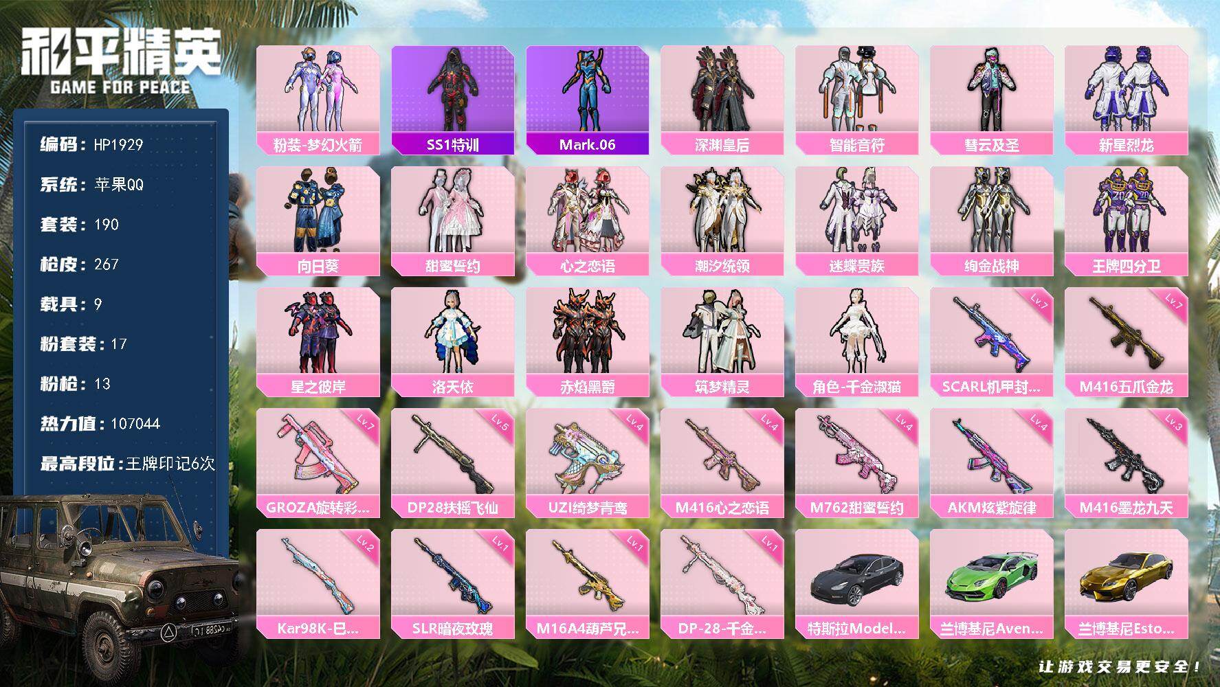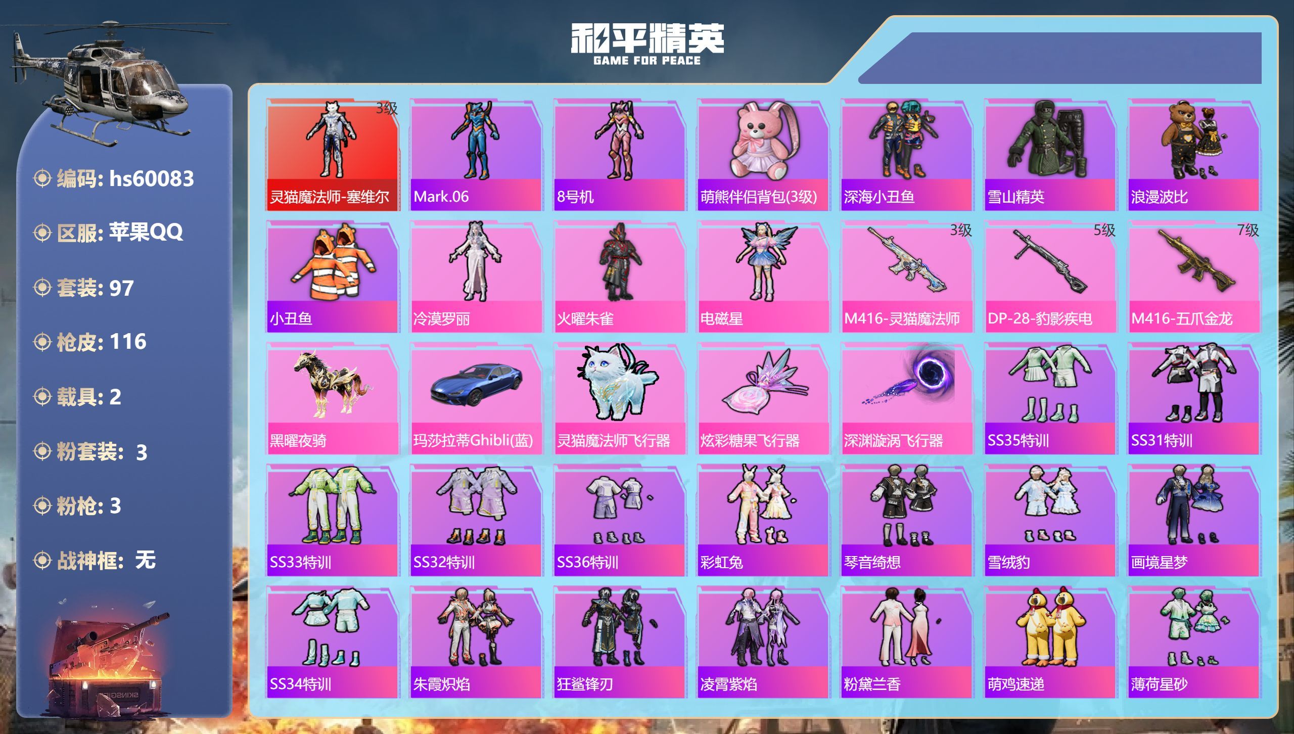 hs60083 苹果手Q-7王牌印记-1红装-3粉装-3特效枪-2载具-42603热力值-97套装-