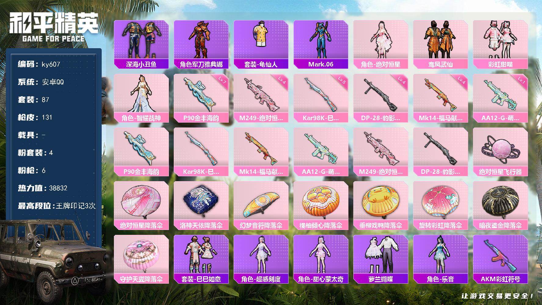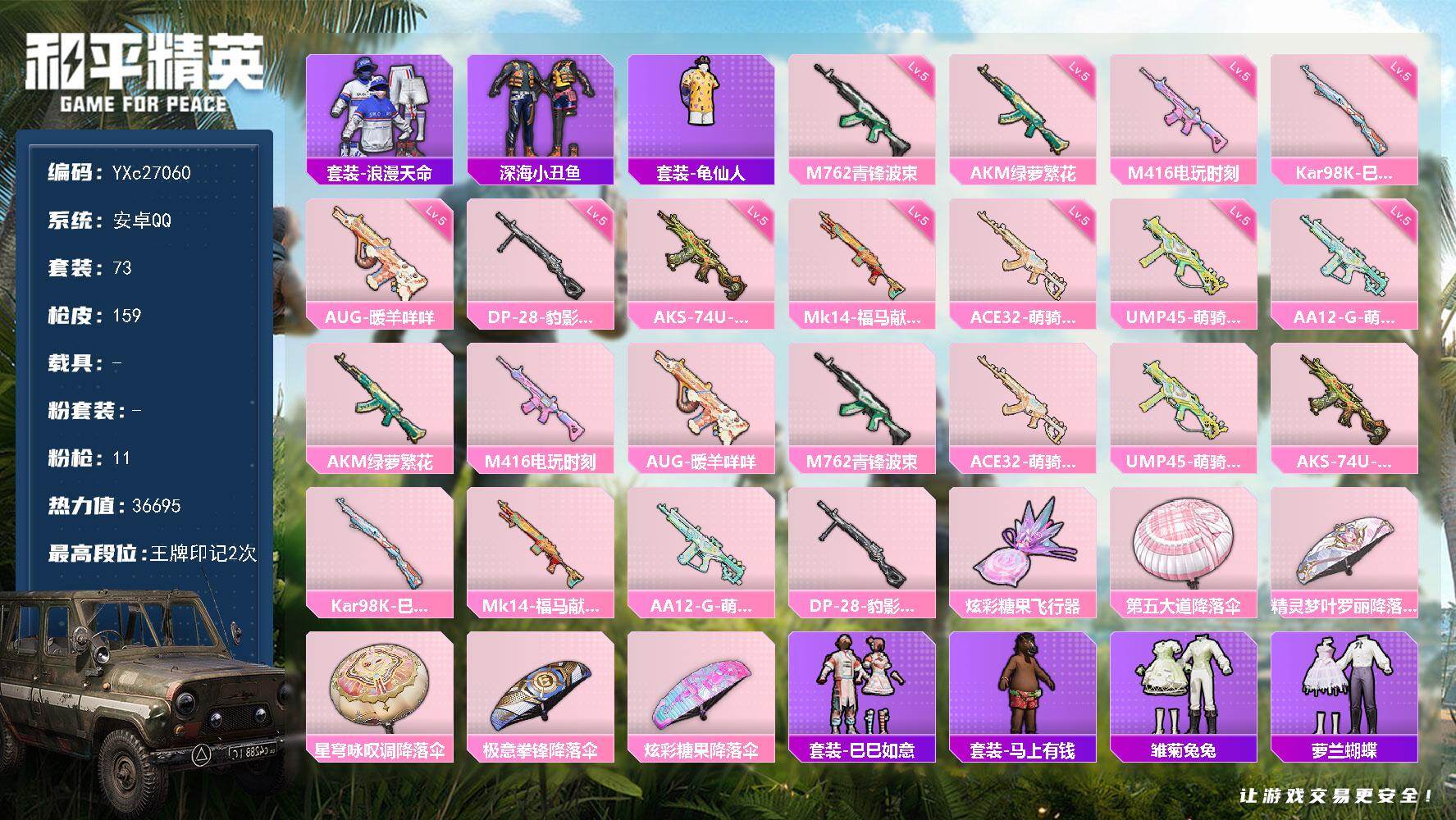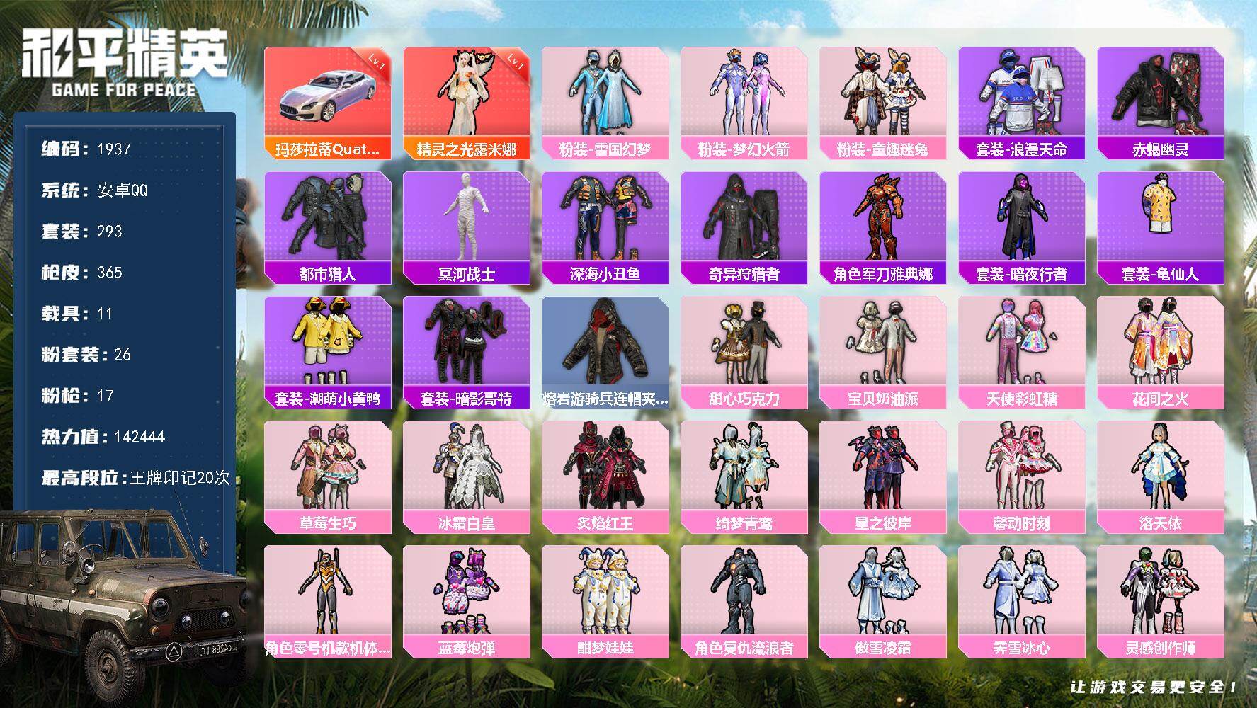 安卓 手Q-1神装-26粉装-17特效枪-11载具-10粉色飞行器-14244