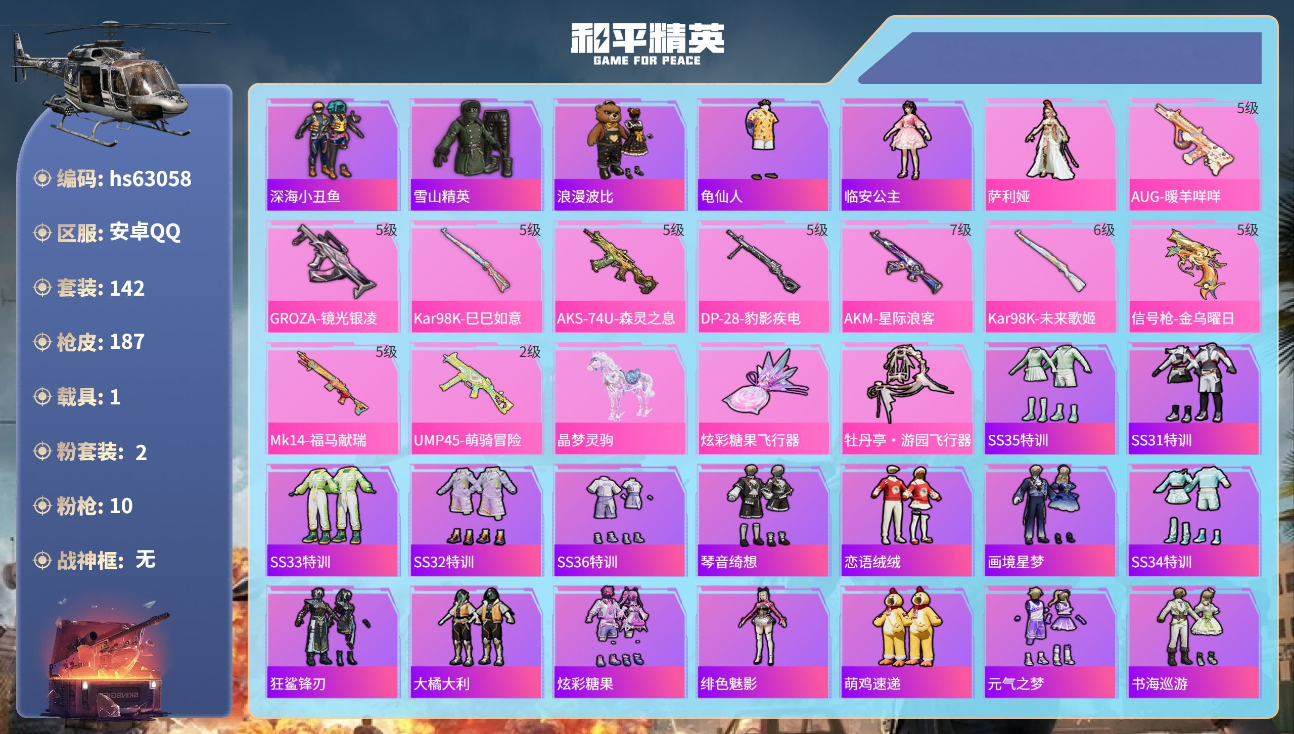hs63058 安卓手Q-7王牌印记-2粉装-10特效枪-1载具-59395热力值-142套装-18