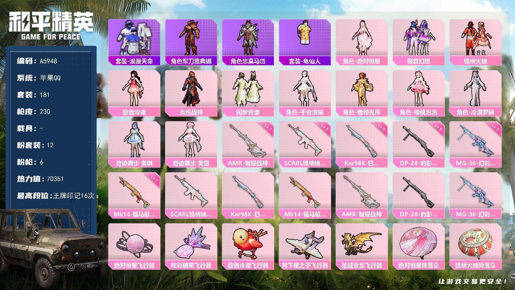 12粉装-6特效枪-0载具-5粉色飞行器-70351热力值-16王牌印记-181套装-230枪皮