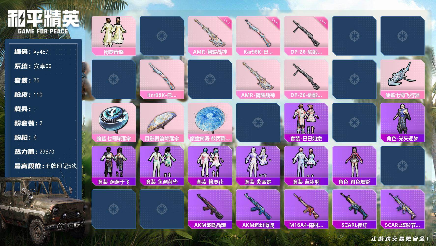 2粉装-6特效枪-0载具-2粉色飞行器-29670热力值-5王牌印记-75套装-110枪皮