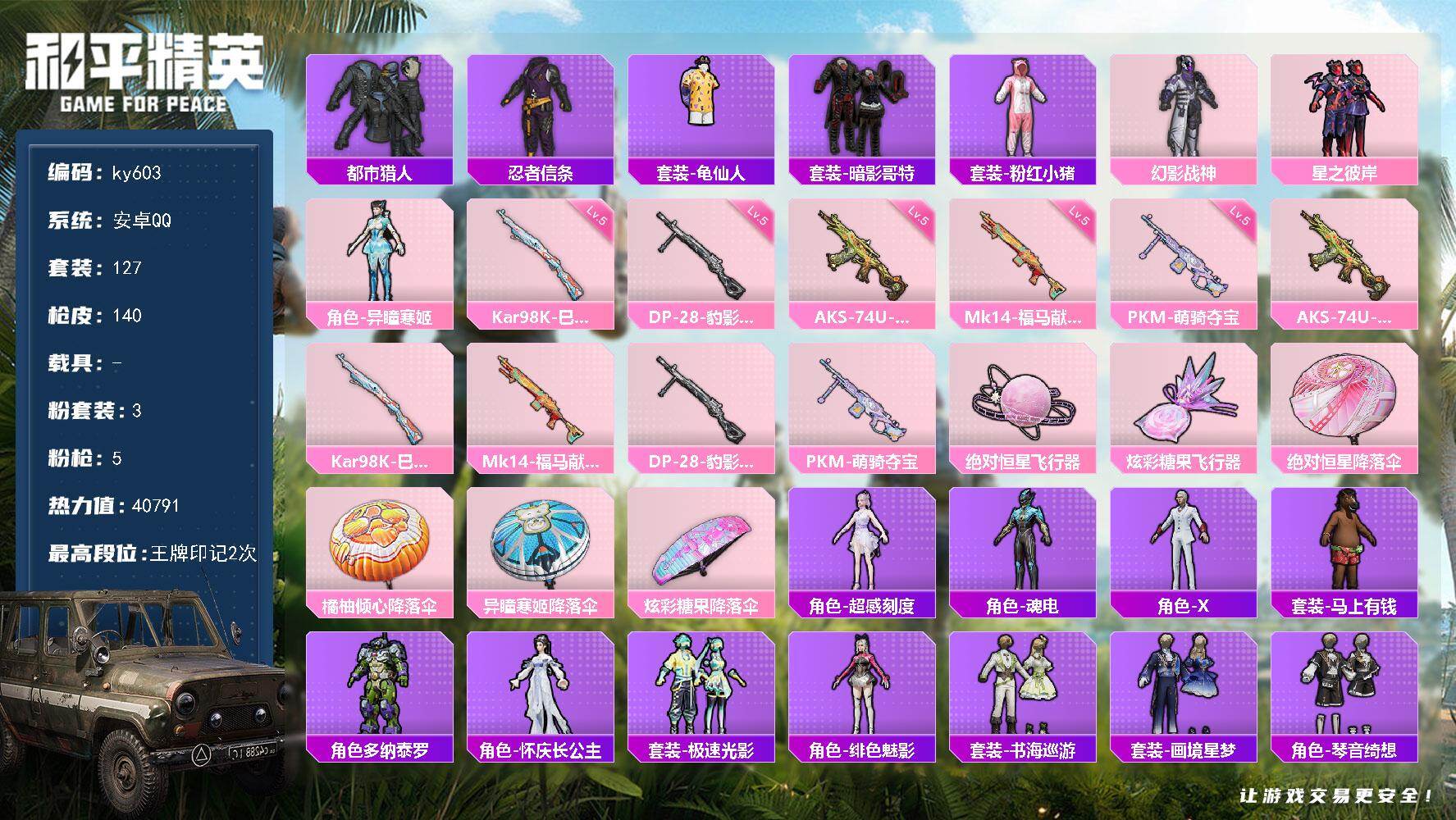 3粉装-5特效枪-0载具-2粉色飞行器-40791热力值-2王牌印记-127套装-140枪皮