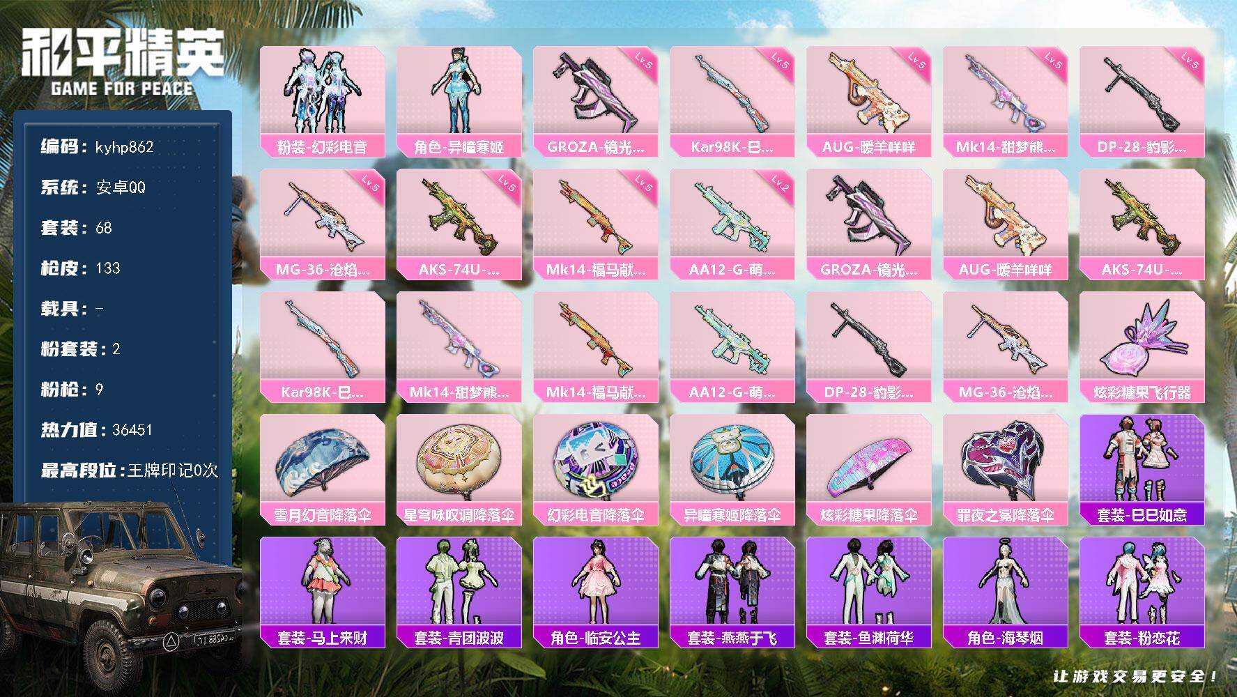 2粉装-9特效枪-0载具-1粉色飞行器-36451热力值-2王牌印记-68套装-133枪皮