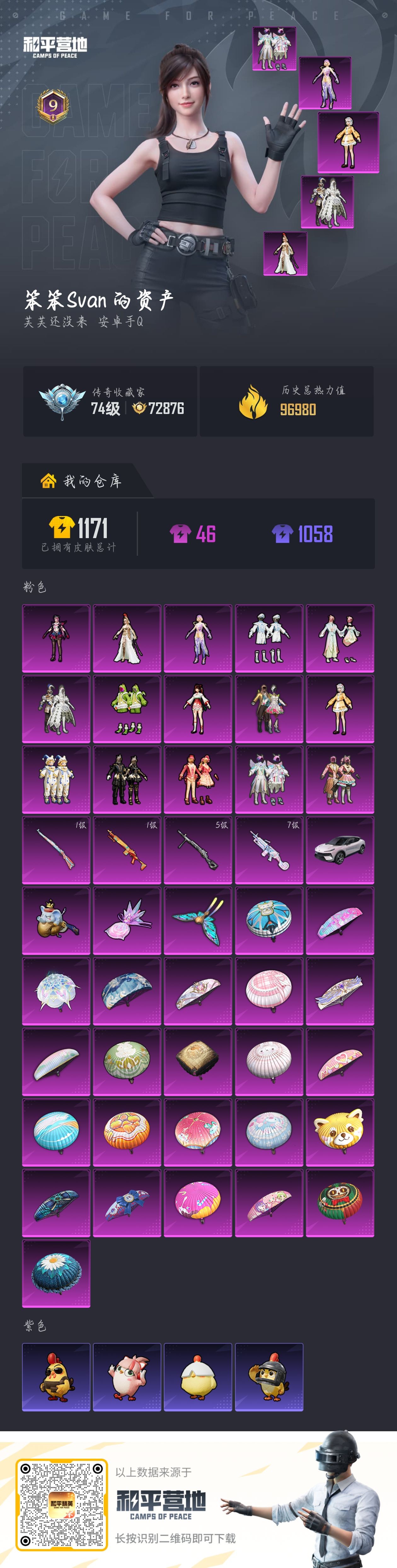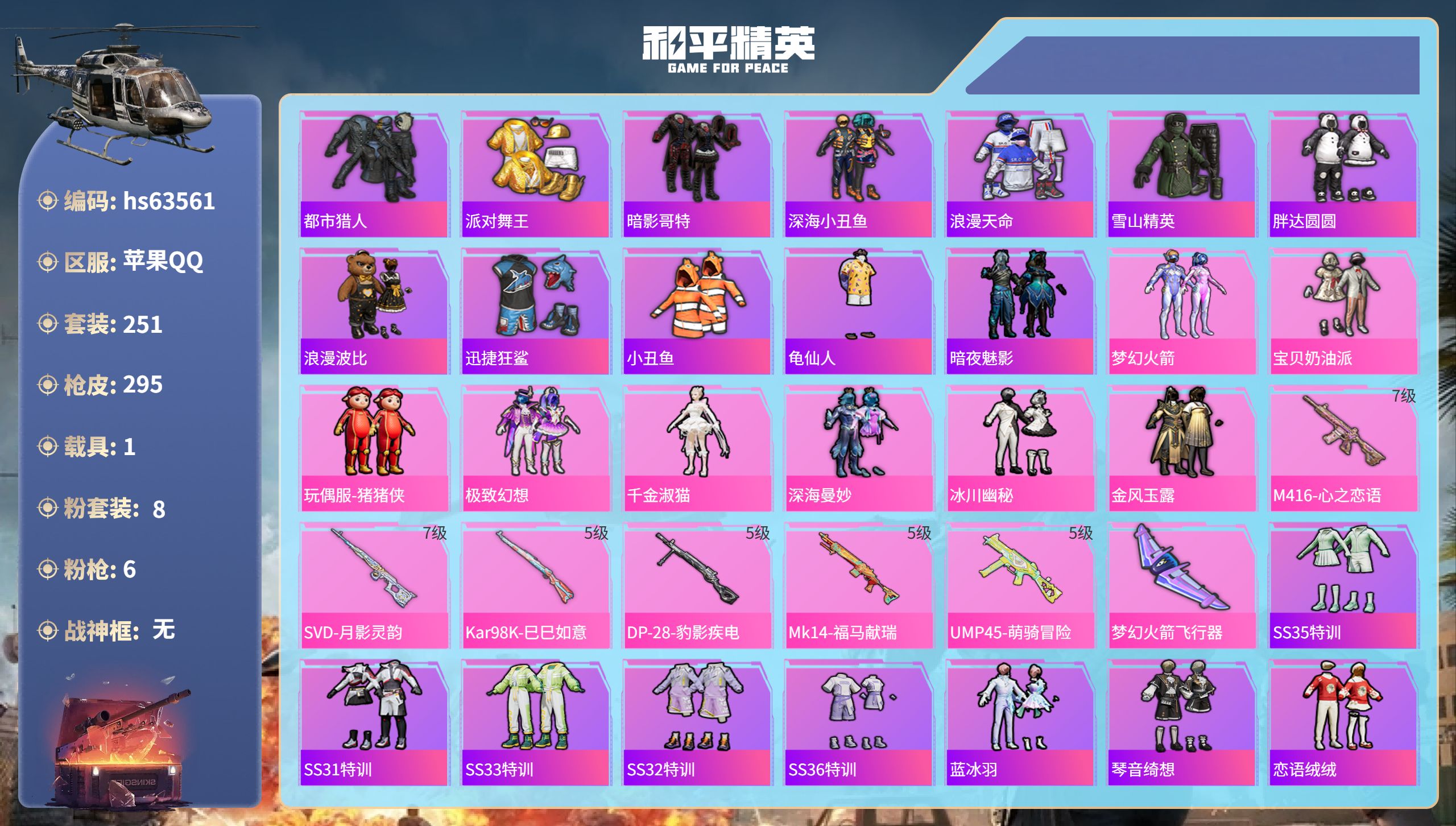 11粉装-11特效枪-3载具-4粉色飞行器-102898热力值-16王牌印记-215套装-280枪皮