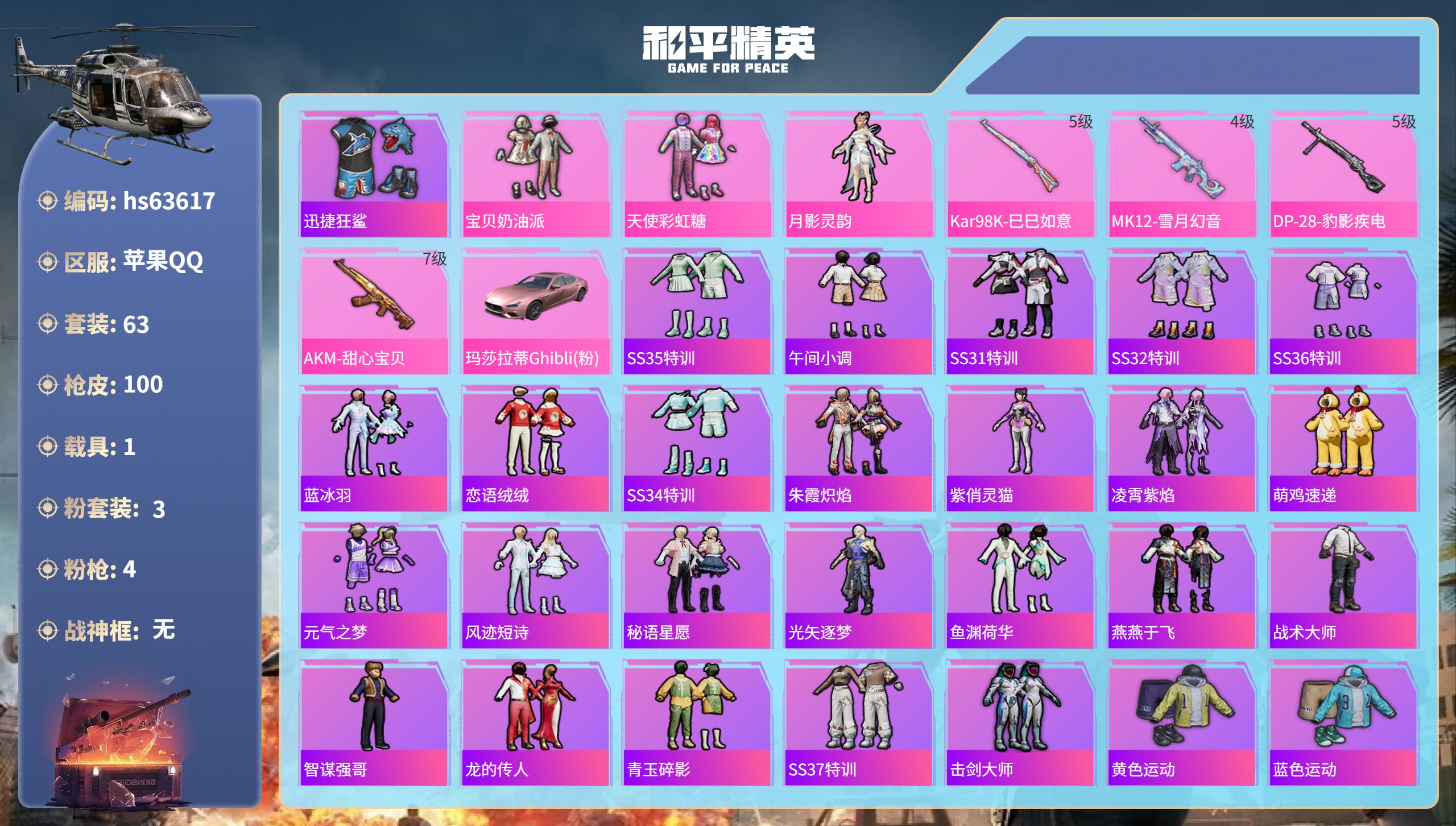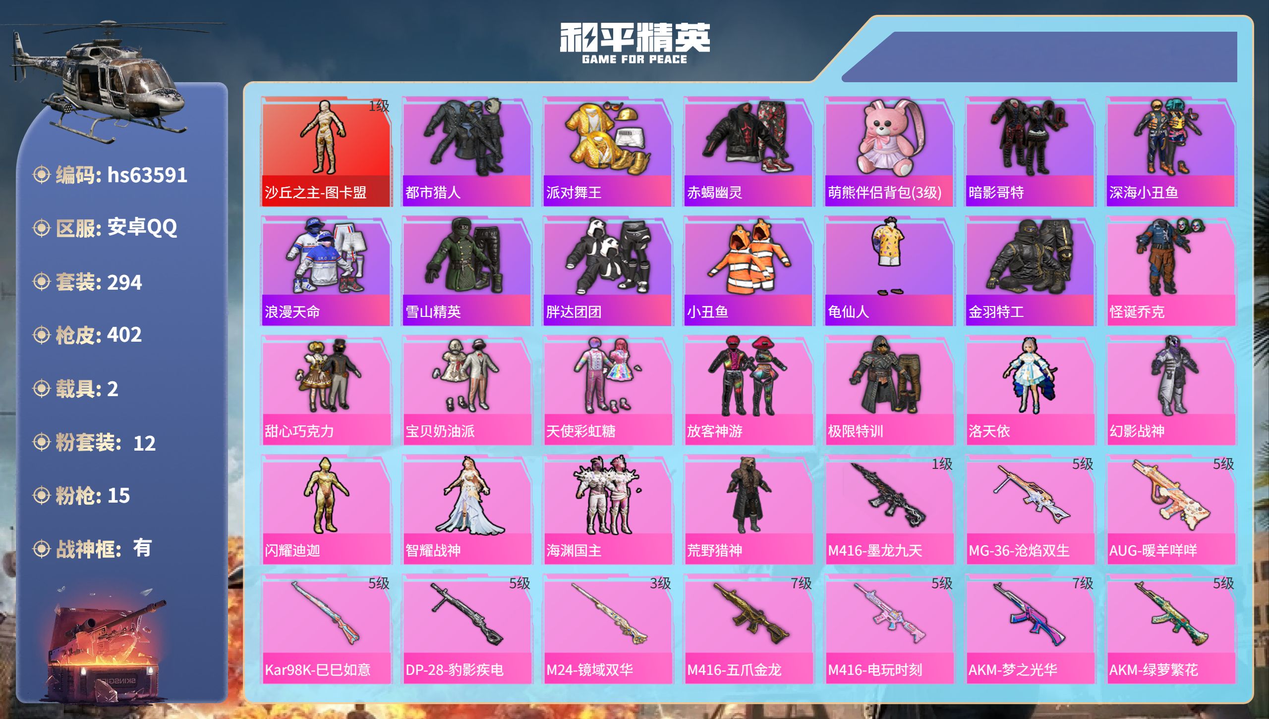5粉装-12特效枪-0载具-2粉色飞行器-58670热力值-11王牌印记-128套装-197枪皮