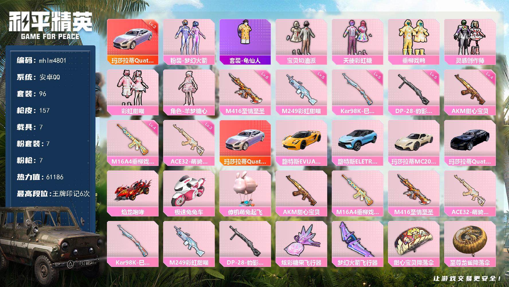 7粉装-7特效枪-7载具-2粉色飞行器-61186热力值-6王牌印记-96套装-157枪皮